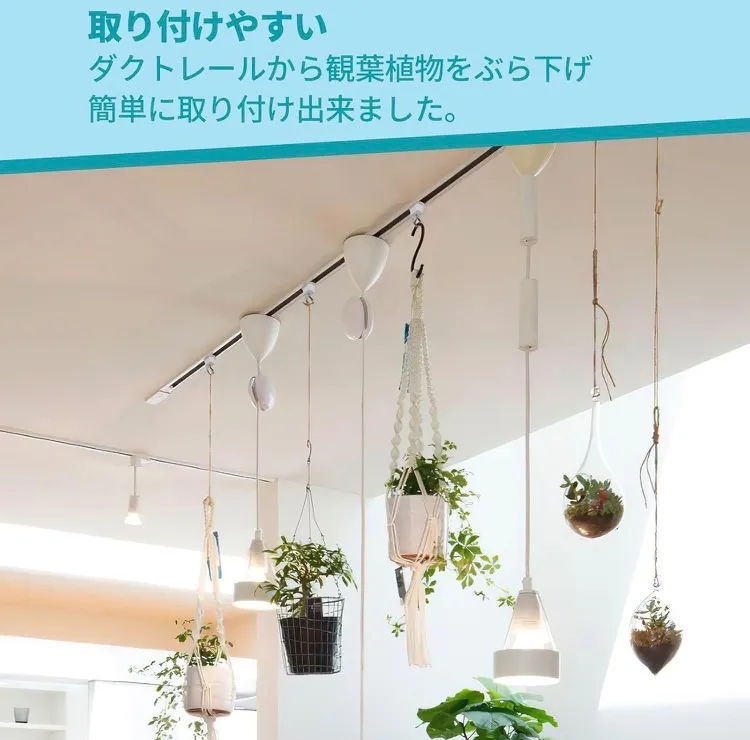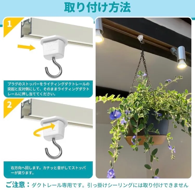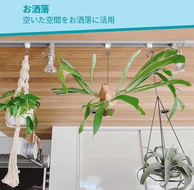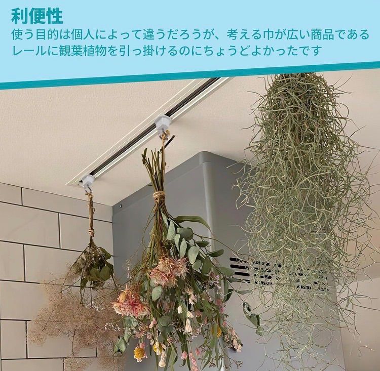 【特長】ダクトレールにはめて半回転させるだけなのでとても簡単に設置できます。ドライフラワーのスワッグなど軽いものを引っ掛けるのに使用しています。フックがあると色々アレンジできますし、フックにグリーンを飾ると部屋の雰囲気も変わってなかなか良いですね。 3、