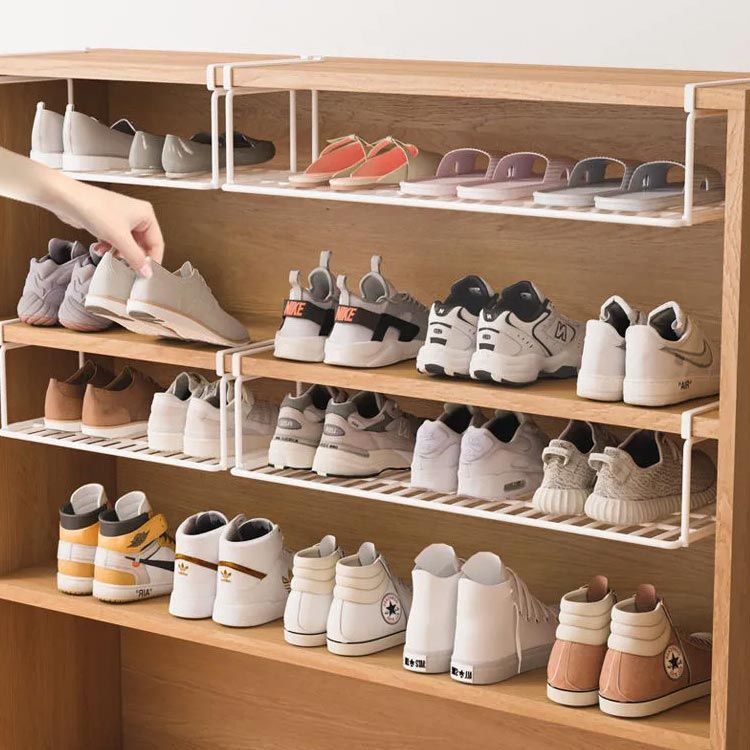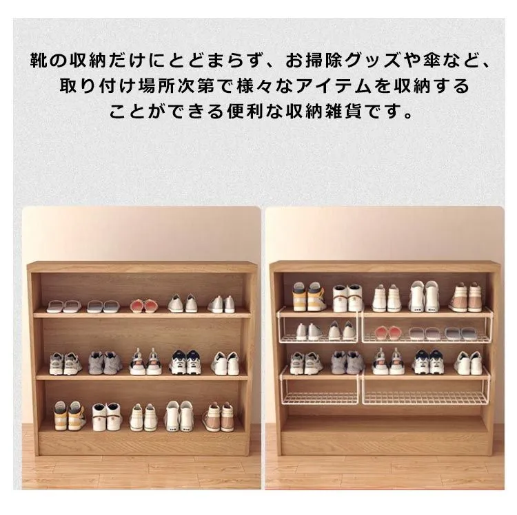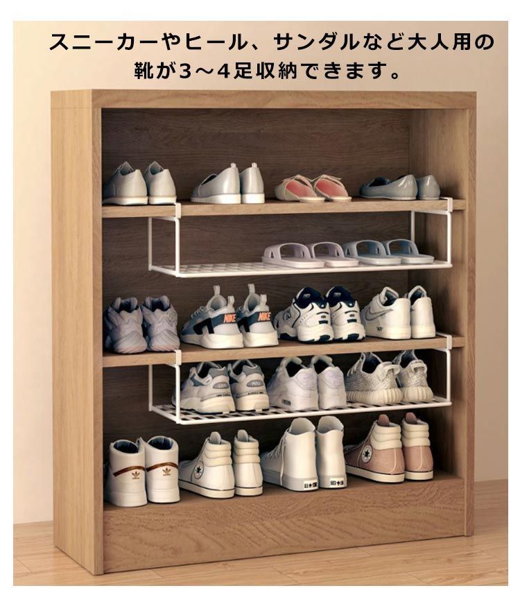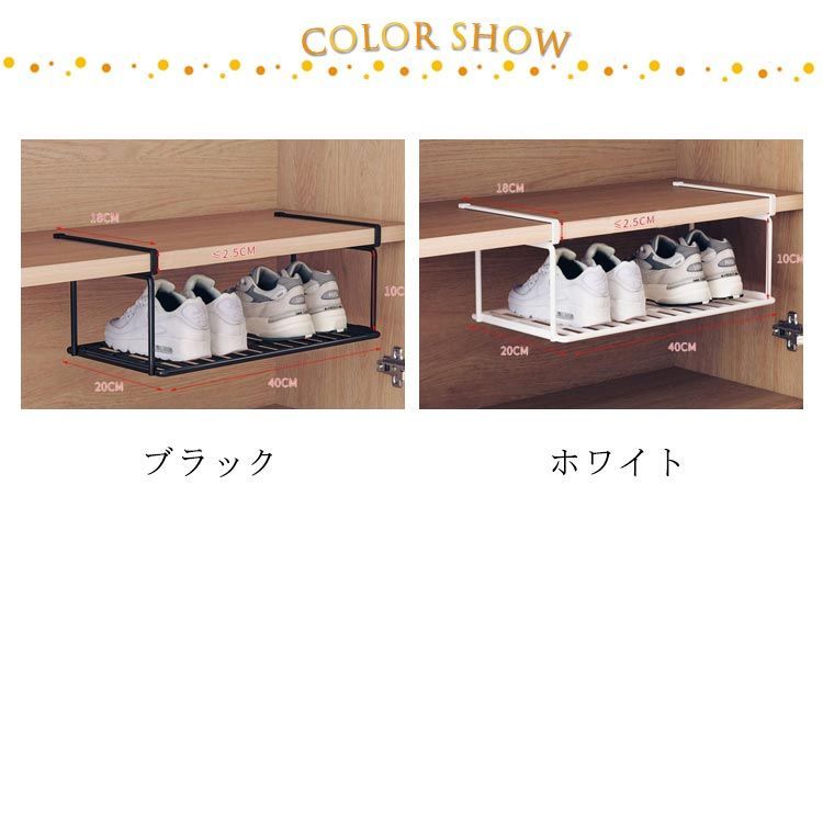 素材:鉄 色:ホワイト ブラック 下駄箱やシューズクロークの棚下に差し込むだけで、靴箱下の空間を有効活用できる浮かせるシューズラック。 スニーカーやヒール、サンダルなど大人用の靴が3~4足収納できます。 靴の収納だけにとどまらず、お掃除グッズや傘など、取り付け場所次第で様々なアイテムを収納することができる便利な収納雑貨です。 差し込むだけの簡単取り付けで、下駄箱下を新たな収納スペースとして活用できます。 スペースが限られたエントランスの収納力をアップさせて、玄関まわりが片付く便利な靴収納です。