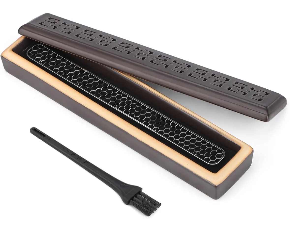 Segarty 陶器製 香炉 お香たて 横置きタイプ 茶色 掃除用箒付きセット ステンレスネット付き 灰がこぼれない 仏具 和モダン香皿 水洗い おしゃれ 線香たて ヨガ 瞑想リラックス 睡眠 ギフト適応