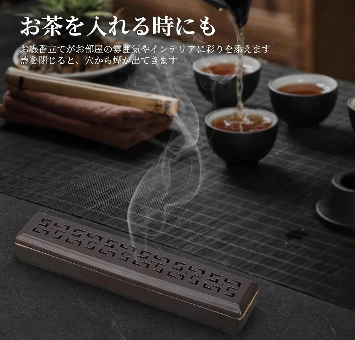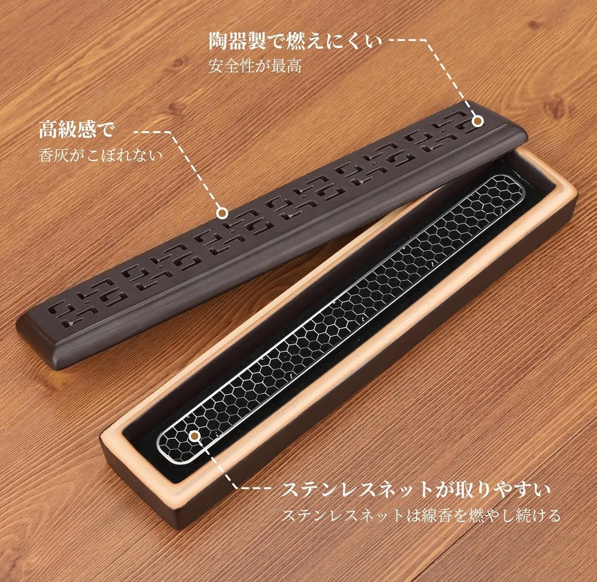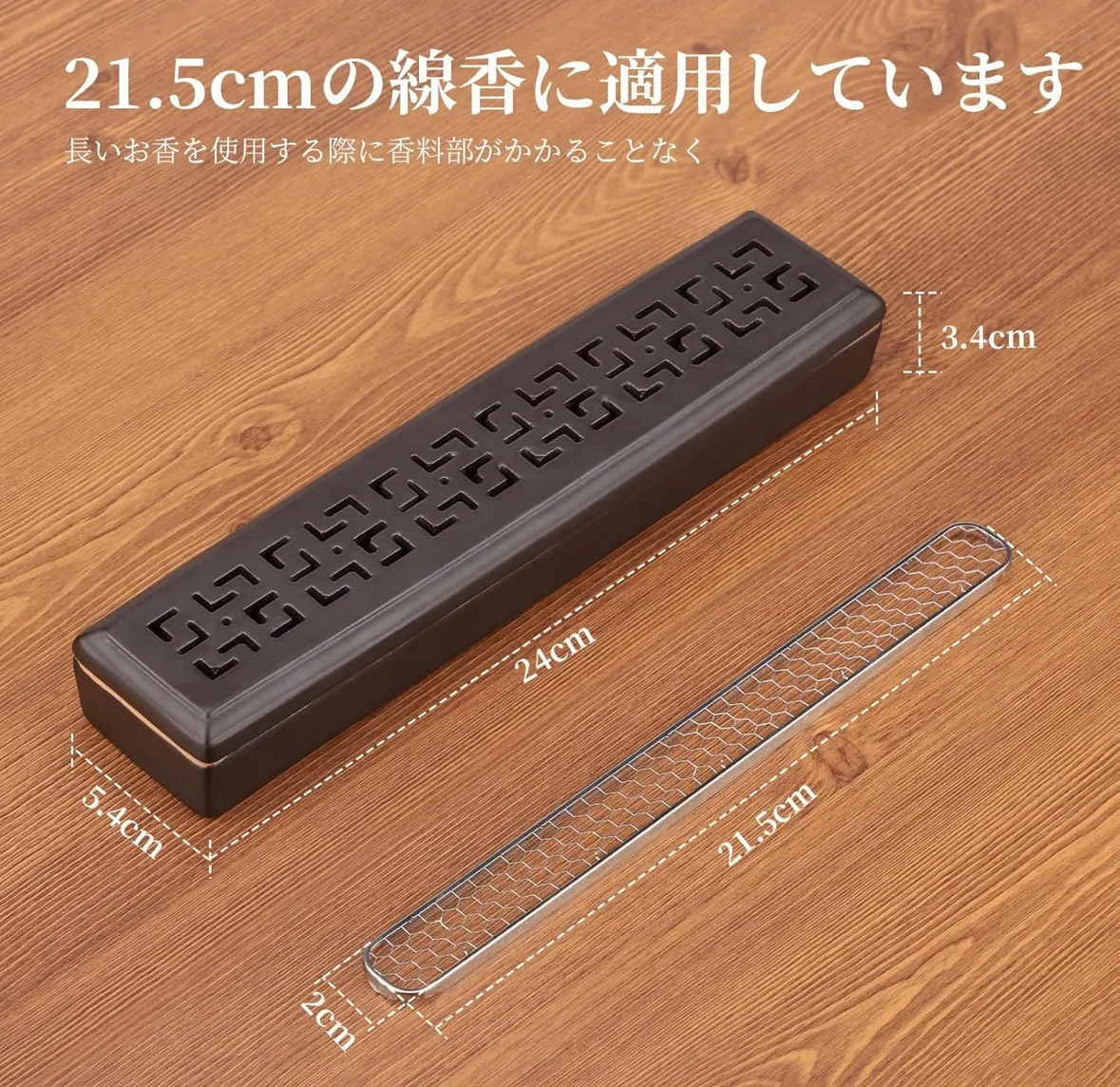 【製品仕様】製品サイズ:長さ24㎝ X幅5.4㎝ X厚さ3.4㎝ 本体重量:約450g ステンレスネットサイズ:長さ21.5cm X幅2㎝ お香の長さ:21.5㎝まで可能 素材:陶器 カラー:茶色