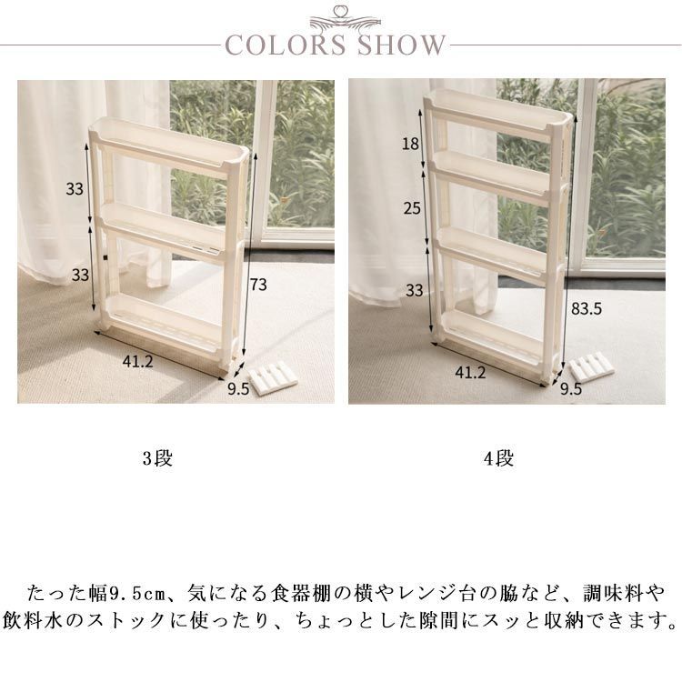 たった幅9.5cm、気になる食器棚の横やレンジ台の脇など、調味料や飲料水のストックに使ったり、ちょっとした隙間にスッと収納できます。