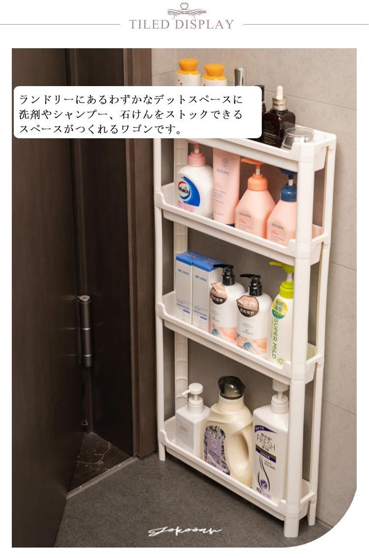 ランドリーにあるわずかなデットスペースに洗剤やシャンプー、石けんをストックできるスペースがつくれるワゴンです。