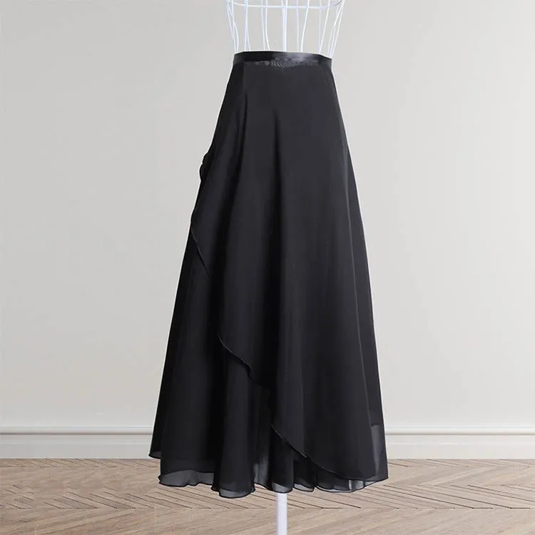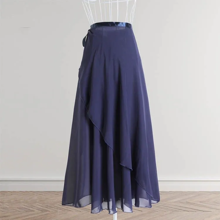 軽やかなシフォンが動くたびにふんわりと広がる、ロング丈のバレエ用巻きスカートです。
