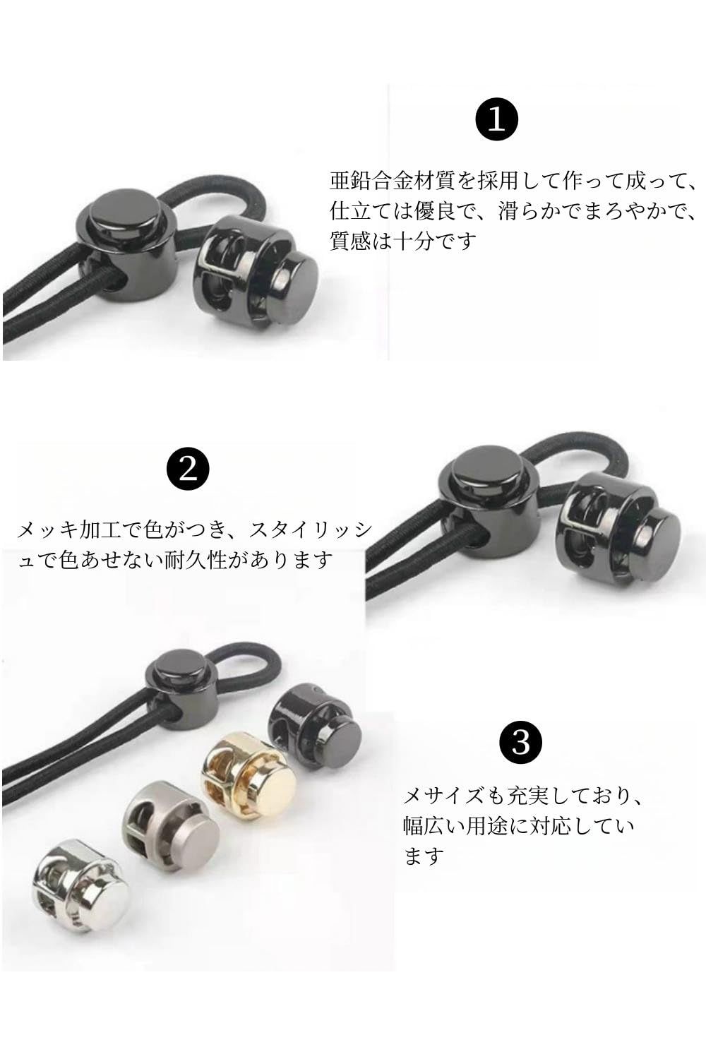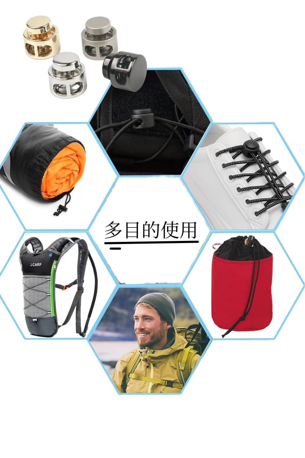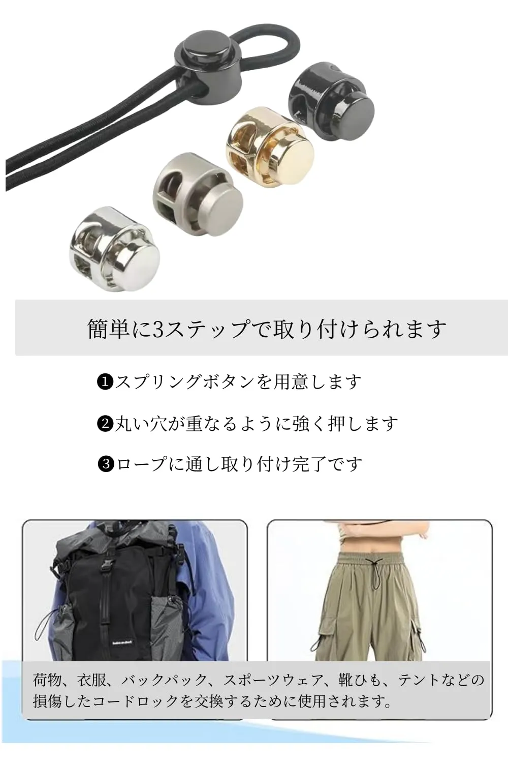 【用途】荷物、衣服、バックパック、スポーツウェア、靴ひも、テントなどの損傷したコードロックを交換するために使用されます。
