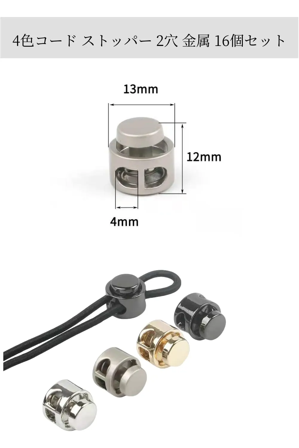 【セット内容】コード ストッパー 2穴 金属 16個セット、長さ:約12mm 横幅:約13mm 穴の直径:約4mm、色:4色