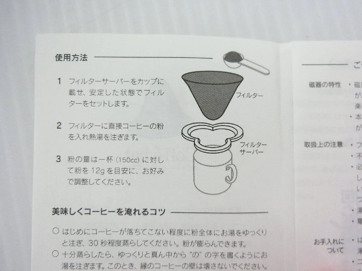 紙を使わないセラミックコーヒーフィルターです。おおむね状態は良好です。遠赤外線効果とミクロの穴が水のカルキ臭や不純物を取り除き まろやかで飲みやすいコーヒーが楽しめます。浄水器の代わりにもご使用いただけます。