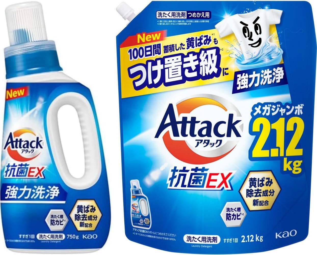 アタック抗菌EXは、100日間蓄積した黄ばみやつけ置き級の頑固な汚れに対して強力な洗浄力を発揮する洗濯用洗剤です。本体がなくなってもすぐ補充できる2.12kgの詰め替えのセット商品となっており便利にお使いいただけます。黄ばみ除去成分が配合されており、24時間抗菌効果も期待できます。つめこみ洗いでもしっかり洗えるため、忙しい日常生活に最適です。洗たく槽の防カビ効果もあり、洗濯機を清潔に保ちます。持ちやすく注ぎやすい新フィット注ぎ口を採用しているため、詰め替え作業もスムーズに行えます。スプラッシュクリアの香りで、洗い上がりも爽やかです。すすぎ1回でも使用可能で、節水や時短にも貢献します。残り湯でも洗えるため、水道代の節約にもなります。日常の洗濯から頑固な汚れまで、幅広くお使いいただける高性能な洗濯用洗剤です。