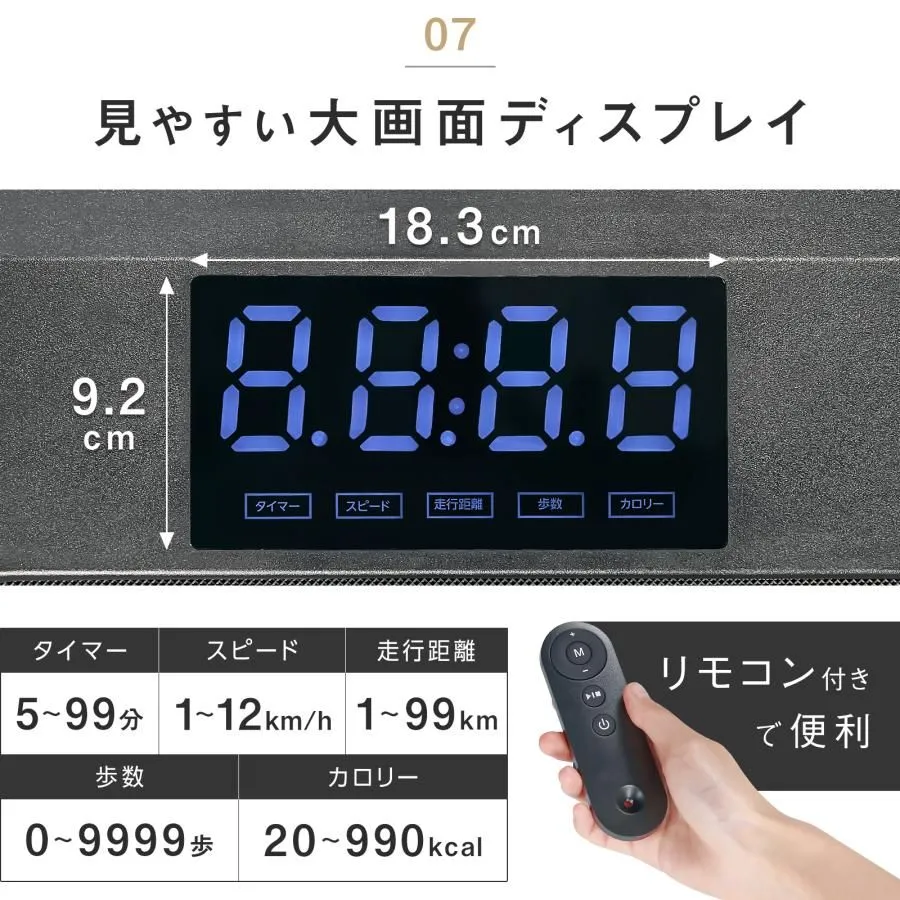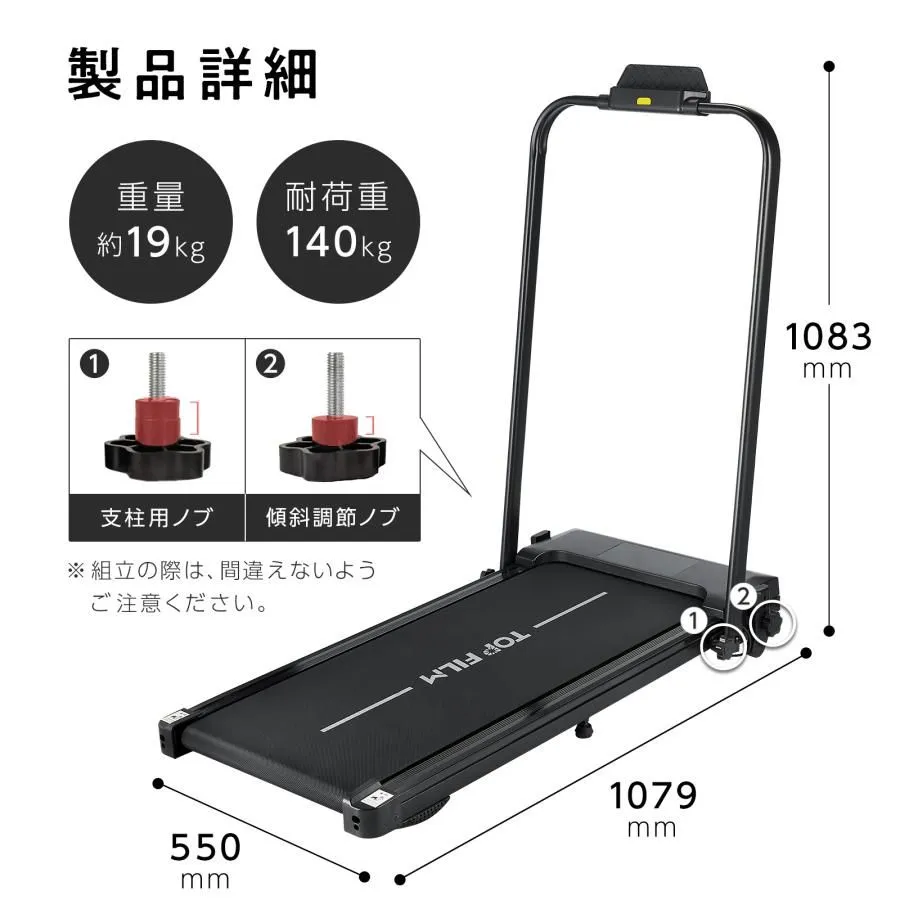 【製品詳細】 重量:約19kg 耐荷重:140kg サイズ(組立時):1079mm×550mm×1083mm サイズ(収納時):1190mm×590mm×130mm サイズ(折畳時):1146mm×550mm×120mm ランニングエリア:385mm×930mm 速度(組立時):1〜12km/h 速度(収納時):1〜6km/h モーター出力:0.65HP 消費電力:500W
