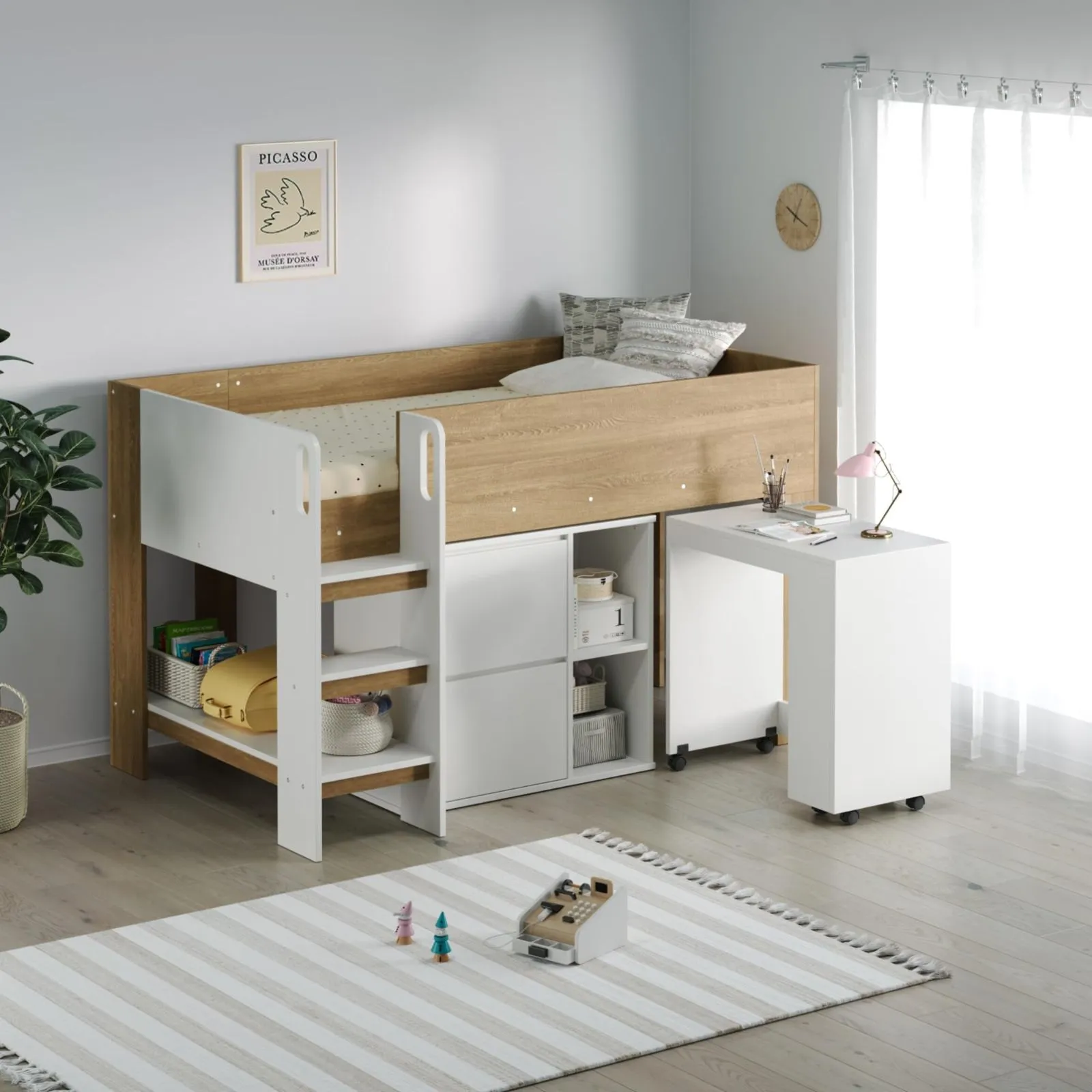 入学時はベッド下にまとめてコンパクトな学習スペースを作り