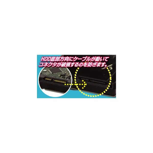 HDD底部にステイを取り付けることで、底部方向にケーブルが動いて起こりやすいコネクタ破損を防ぎます。