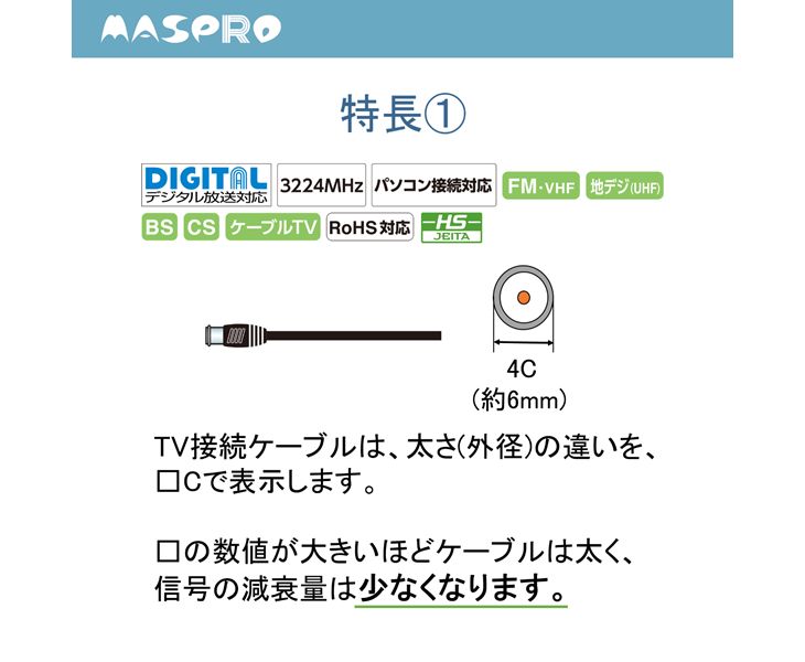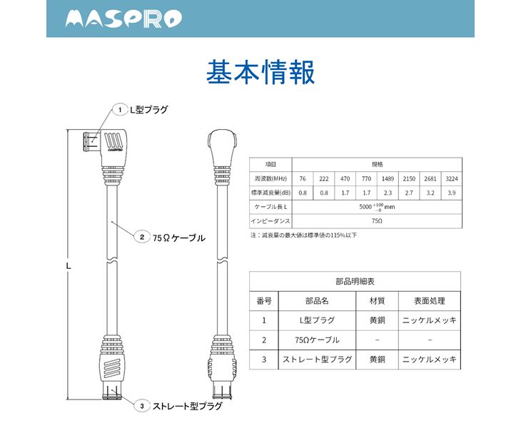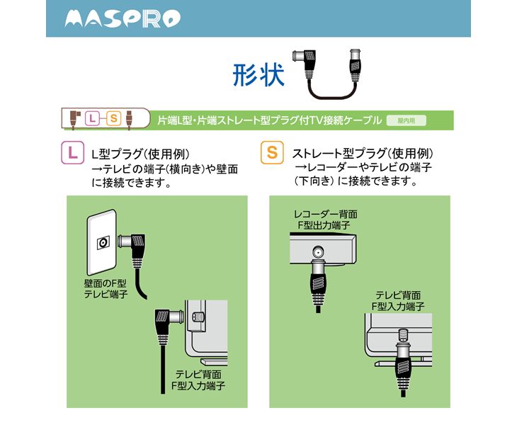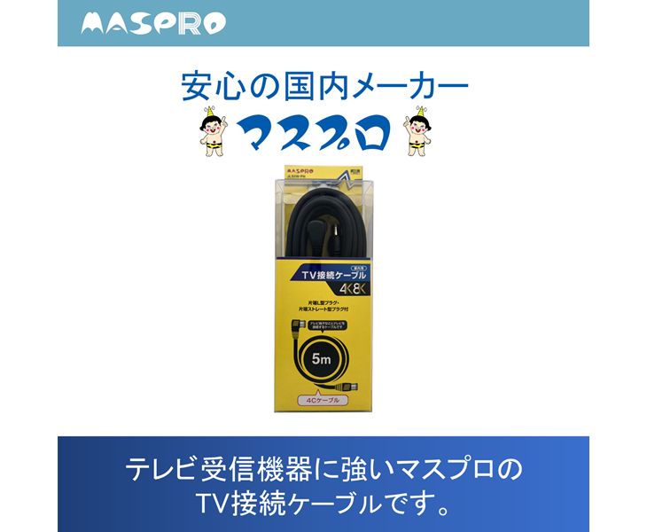 テレビ用接続ケーブル 3224MHz対応TV接続ケーブル5m マスプロ JLS5W-PN 片端L型プラグ 片端ストレート型 4K 8K対応