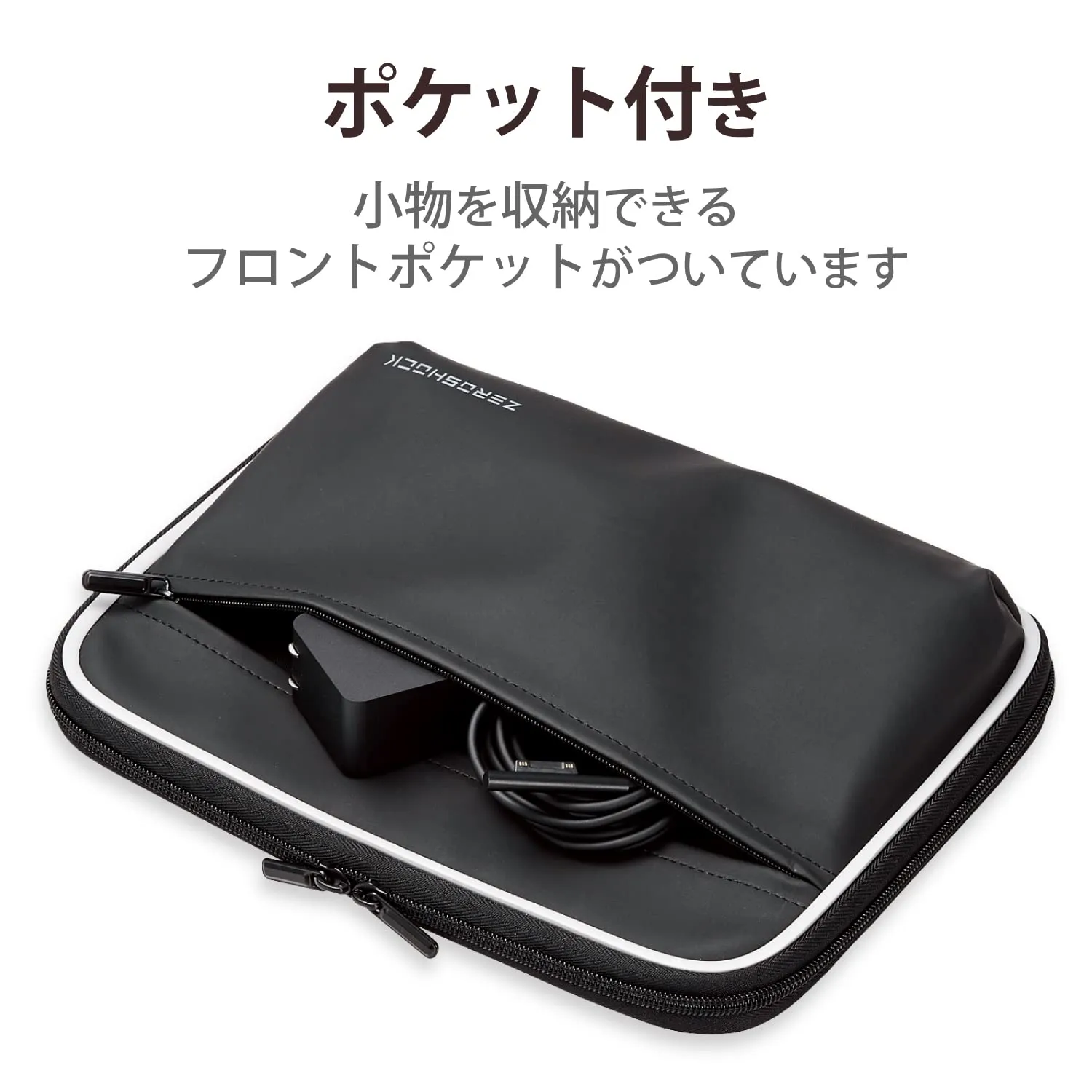 “ZEROSHOCK"です。ウェーブ形状の低反発ポリウレタン(低反発ウェーブフォーム)が効果的に衝撃を吸収します。外部からの衝撃をしっかりと吸収する厚みを保ちながら、体積を少なくして軽量化を実現しています。小物を収納できるフロントポケットがついています。ケース内側には機器本体を傷つけにくい起毛素材を使用しています。開閉がスムーズで機器本体を出し入れしやすいダブルファスナーを採用しています。ケース表面には撥水性に優れたPVC素材を使用しています。