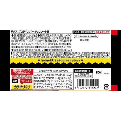 【ザバス プロテインバー チョコレート味の原材料】 乳清たんぱく(アメリカ製造、ニュージーランド製造)、植物油脂、大豆パフ(大豆たんぱく、でん粉、植物油脂)、カカオマス、異性化液糖、砂糖、全粉乳、乳糖、ココアバター/トレハロース、乳化剤、V.C、香料、酸味料、炭酸Ca、ピロリン酸第二鉄、甘味料(スクラロース)、V.B2、V.B6、V.B1、ナイアシン、V.D、(一部に小麦・乳成分・大豆を含む)