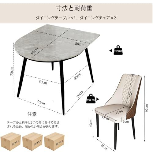 【製品仕様】半円型のダイニングテーブルセット(テーブルダイニングチェア 2脚セット)。テーブルサイズ:約幅90cm奥行80cm高さ75cm。ダイニングテーブルの重さは約27kgです。2脚のダイニングチェア:各チェアの重さは約5kgです。3つの包裹でお届けし、組み立ても簡単です。