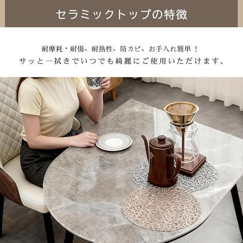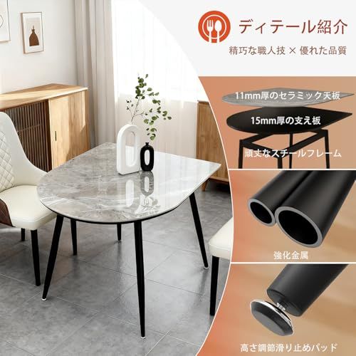 【高品質素材】天板には11mm厚の天然岩板を採用し2人用ダイニングテーブル。自然の模様と光沢が美しく、上品な印象を与えます。耐熱・耐傷・耐汚性に優れ、熱い食器をそのまま置いても安心。天板は汚れや水分に強く、サッと拭くだけで清潔を保てます。長く美しさを保つ高品質な岩板テーブルです。