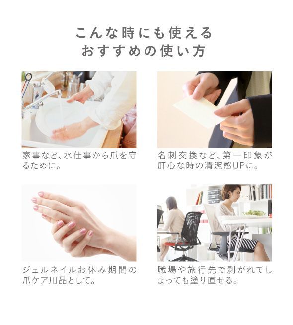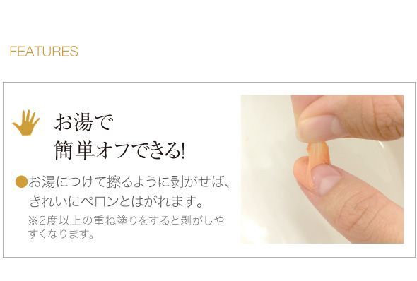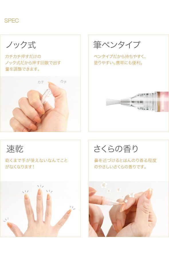 筆ペンタイプで塗りやすくネイルが苦手な人も簡単。速乾なので忙しい人も、いつでもどこでもネイルケアできます。お湯でペロリと剥がせるので、除光液で爪を傷める心配もありません。ほんのりさくらの香り。