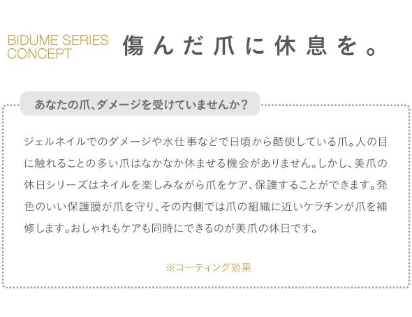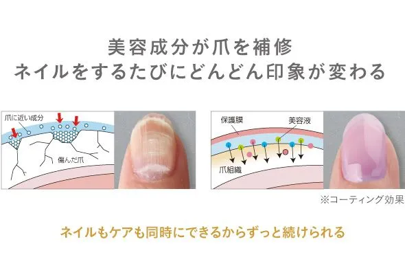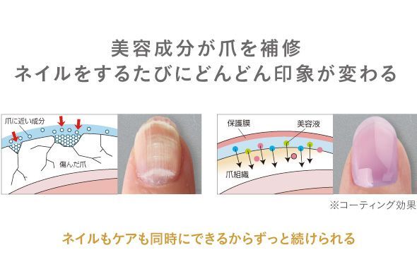 爪の成分に近しい美容成分を配合し、ダメージ爪を潤い補修(コーティング効果)。自然な発色で上品にほんのり色づきます。