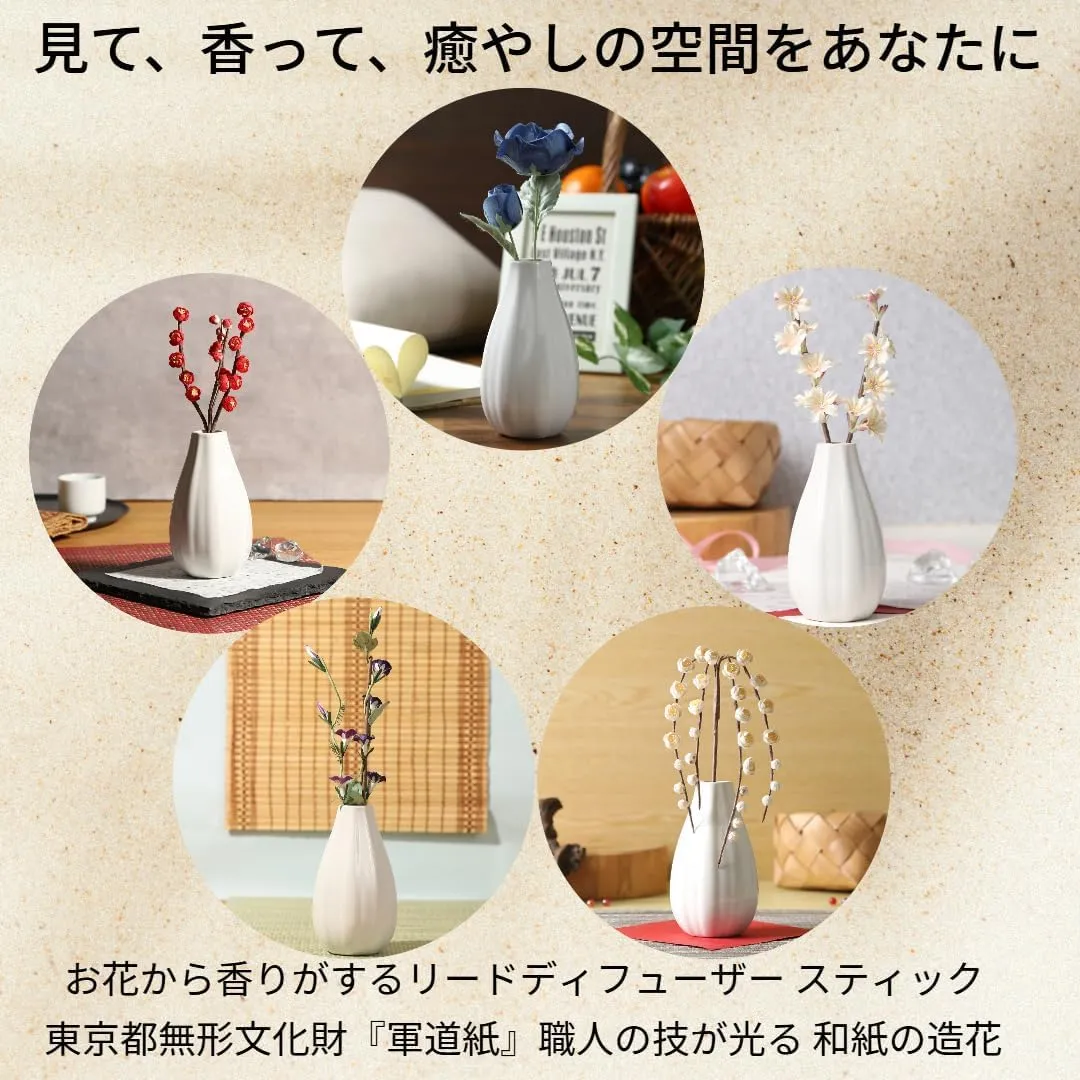 【手漉き和紙の美しさ】 東京都無形文化財の手漉き和紙『軍道紙』を使用し、職人が一つ一つ丁寧に作り上げた造花です。手漉き和紙ならではの繊細な質感・彩りをお楽しみいただけます。 ※花瓶、リードディフューザー用芳香剤は別売りとなります。
