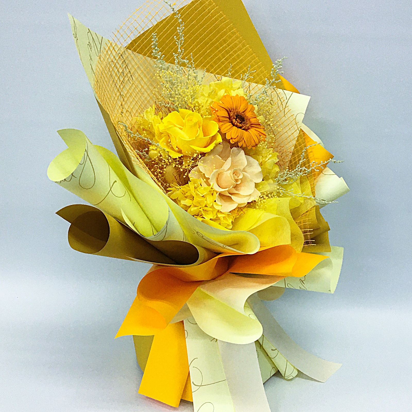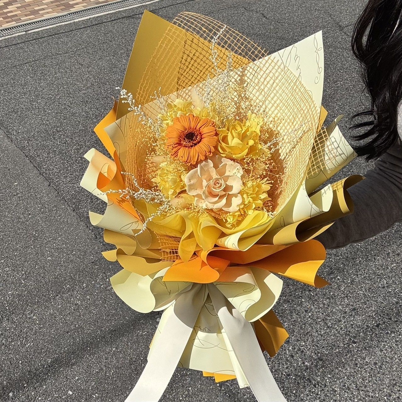 置けるブーケ(ソフトイエロー)B-059は、明るいオレンジのガーベラが華やかに彩られ、気持ちを明るくしてくれる魅力的なフラワーギフトです。このスタイリッシュなデザインは、特別な贈り物としてはもちろん、ご自宅のインテリアをやさしく照らすアイテムとしても最適です。
