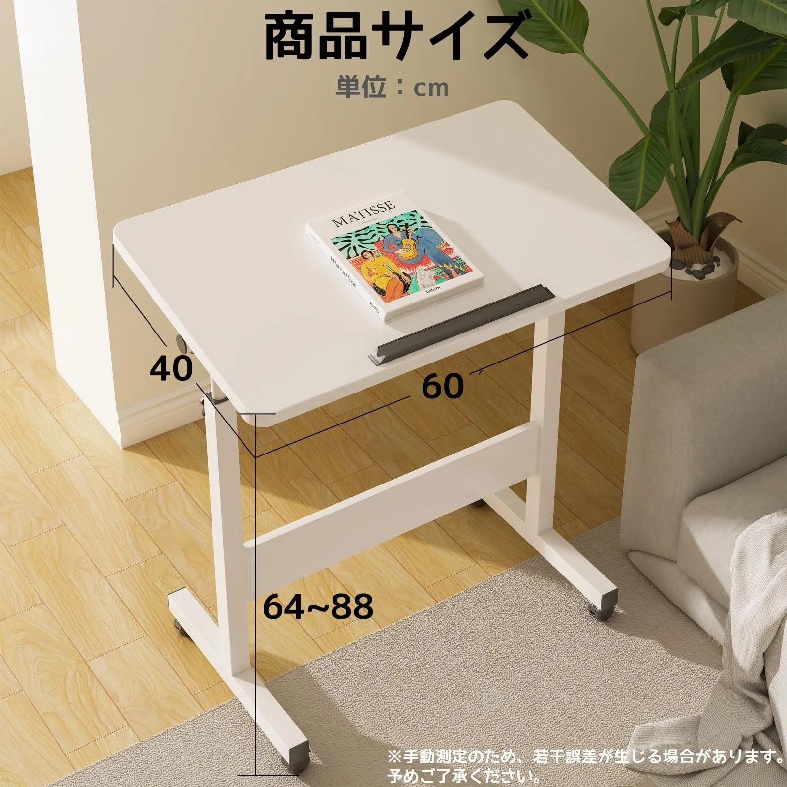 PCデスク サイドテーブル 幅60cm×奥行40cm キャスター付き テーブル 省スペース 高さ調整 おしゃれ シンプル 机 化粧台 北欧 作業机 パソコンデスク 仕事用 組立簡単 折りたたみテーブル (白い 昇降デスク 60*40cm)