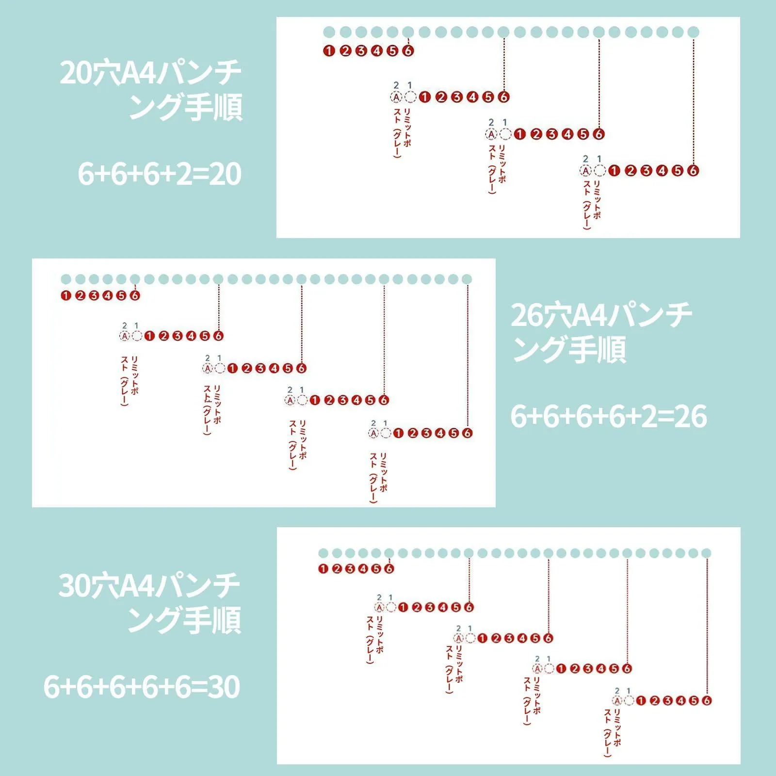 【使用方法】 ルーズリーフ 穴あけパンチ ルーズリーフパンチ (強調)紙を下側にして目盛りに合わせ、カバーを押しながら1つ目の穴を開ける,定規板(グレー)を押し上げると、その後の穴あけが完了します,新たにパンチする穴の数は、リミットポストの位置で制御されます。A4(30穴)/A5(20穴)/B5(26穴)のパンチングについては、画像で説明をご覧ください。