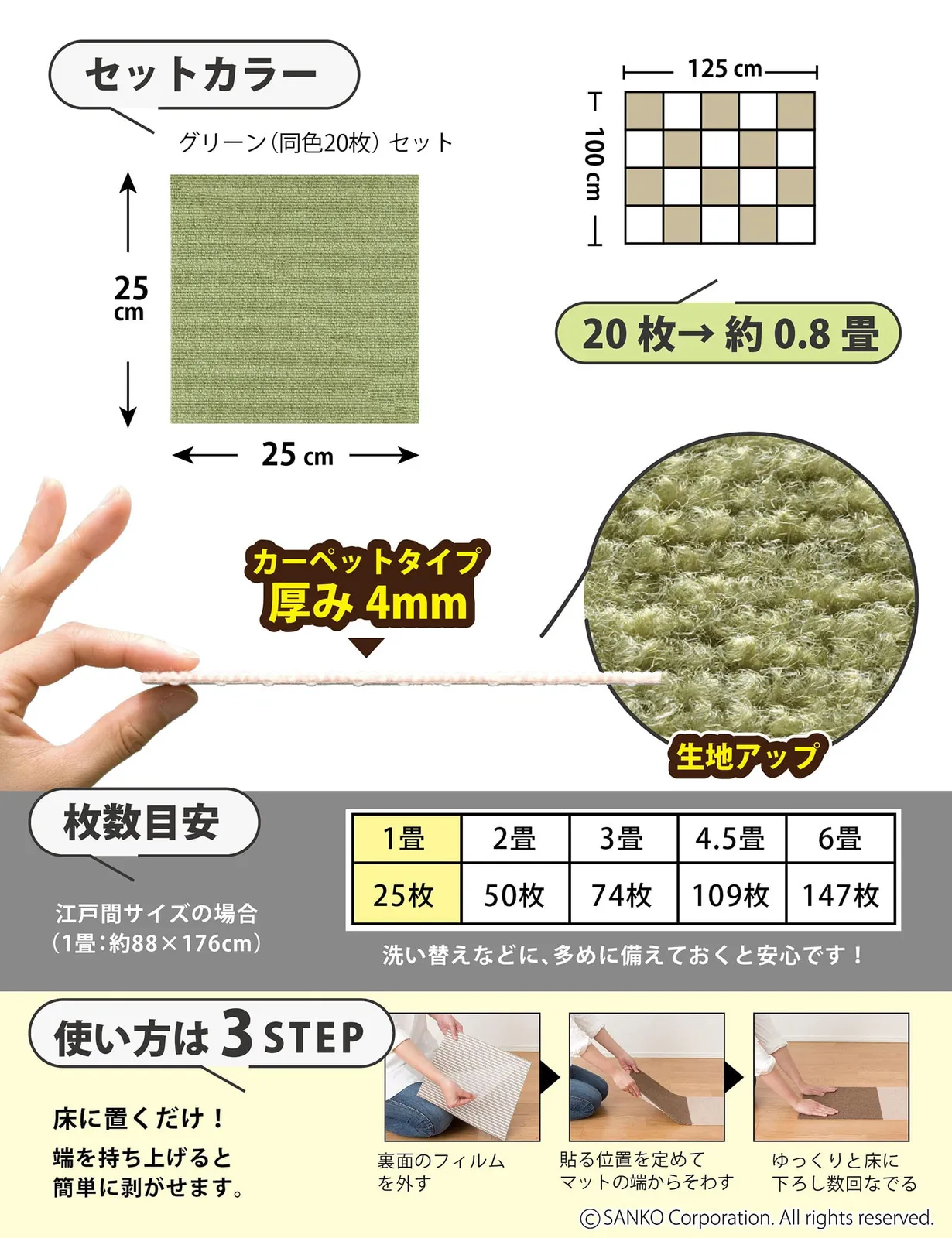 【数量限定】グリーン 25×25cm 20枚 タイルカーペット カーペットタイプ ずれない おくだけ吸着 洗える】サンコー タイルマット 消臭 ジョイントマット 撥水 OJ-84 【日本製