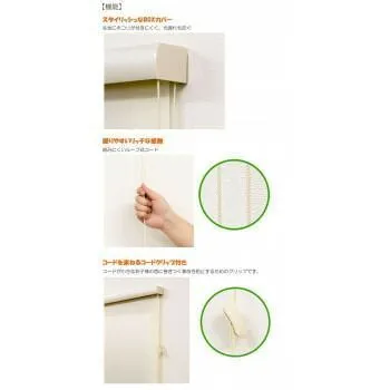 防炎生地を使っている為、燃えにくく、燃え広がらないロールスクリーンです。防炎ラベル付きなので事務所や店舗など、消防法で定められた場所でもお使いいただけます。ボックスタイプ・コードクリップ付きです。