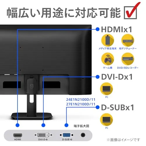 【入力端子/スピーカー】 HDMI1.4(デジタル、HDCP)、D-Sub(VGA)、DVI-D、ヘッドホン端子(audio out) x 1、スピーカー無。