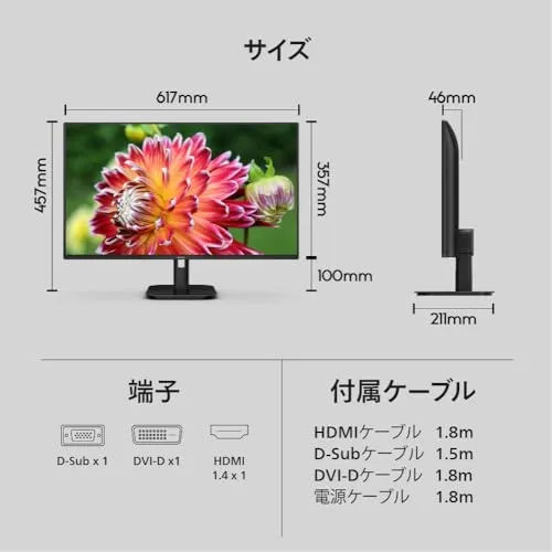 【入力端子/スピーカー】 HDMI1.4(デジタル、HDCP)、D-Sub(VGA)、DVI-D、ヘッドホン端子(audio out) x 1、スピーカー無。