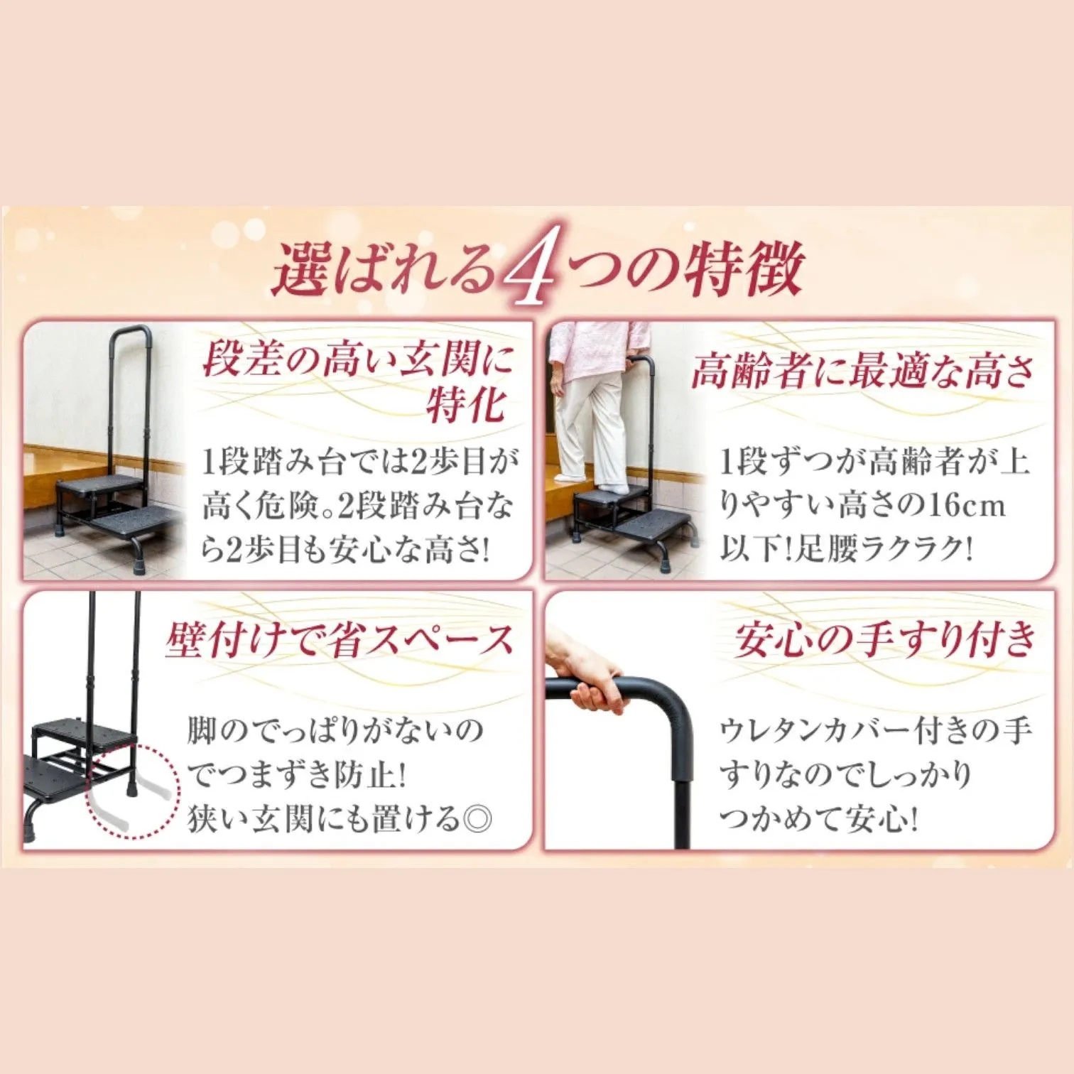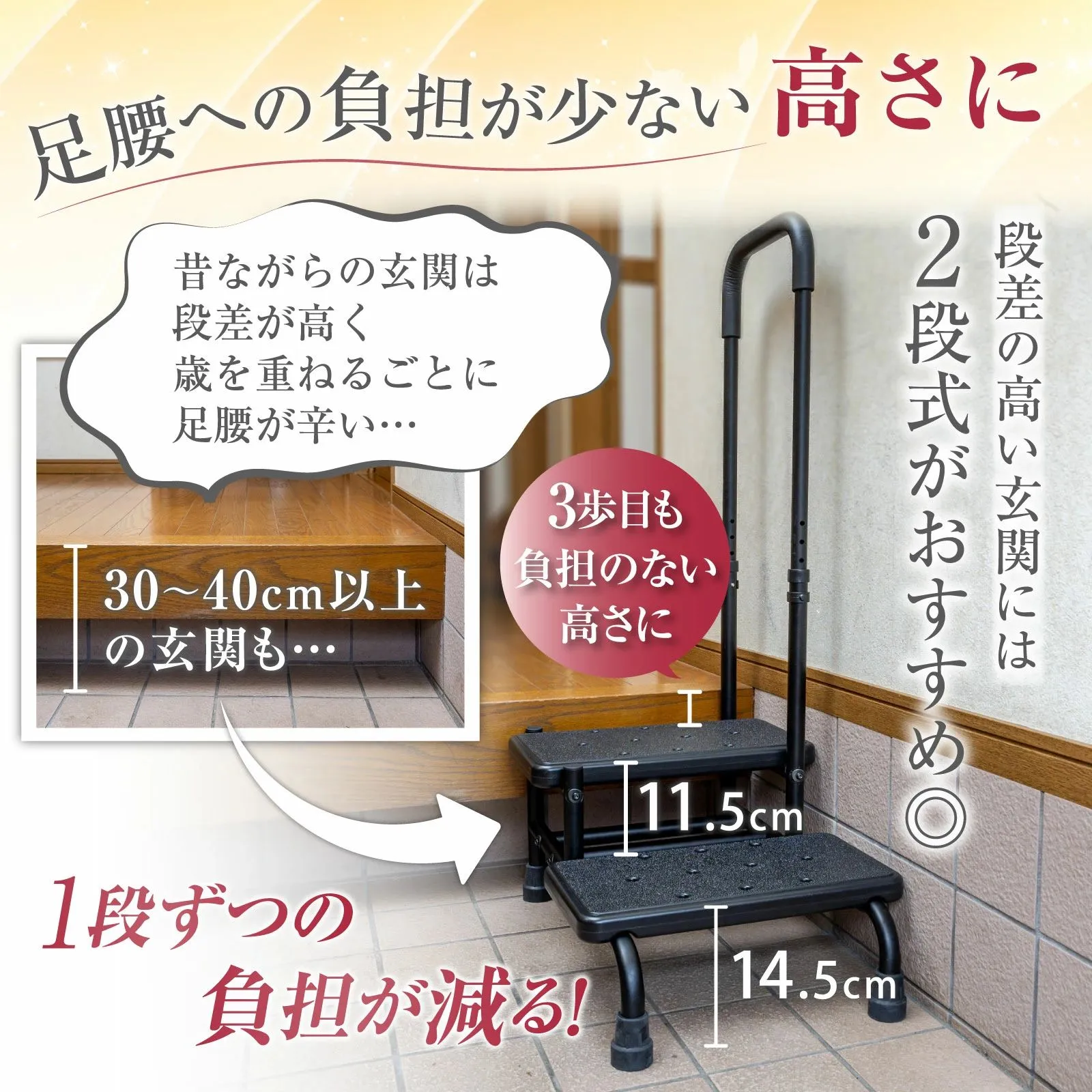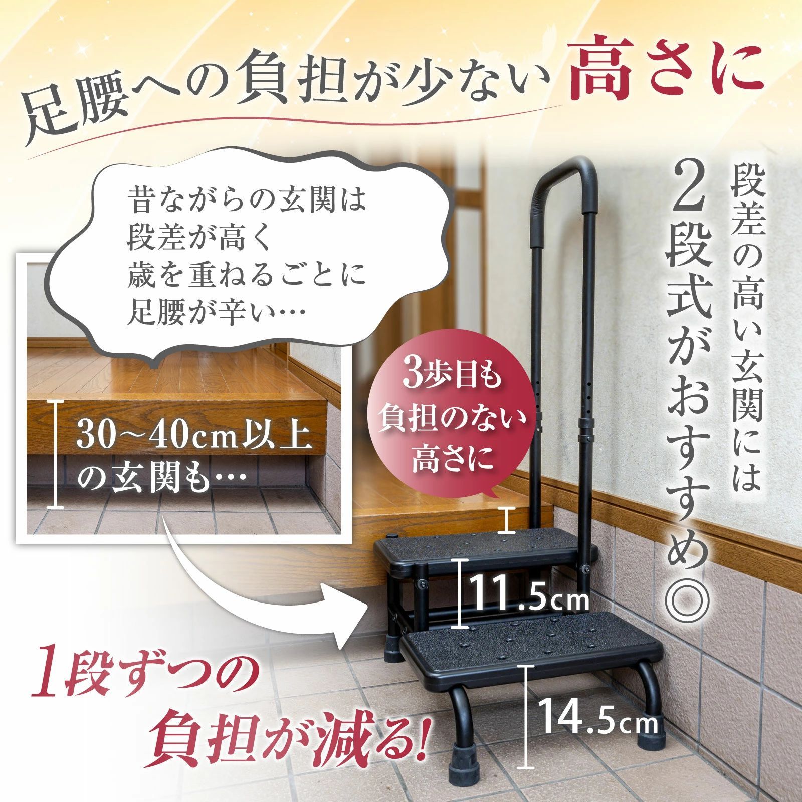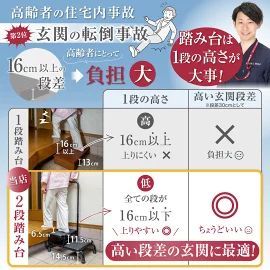 【手すり付き2段踏み台】 段差の高い玄関での転倒や足腰への負担を軽減する、手すり付き・2段式の踏み台です🪜 1段ごとの高さは高齢者にもやさしい設計で、転倒事故が起こりやすい玄関での安全をしっかりサポートします✨