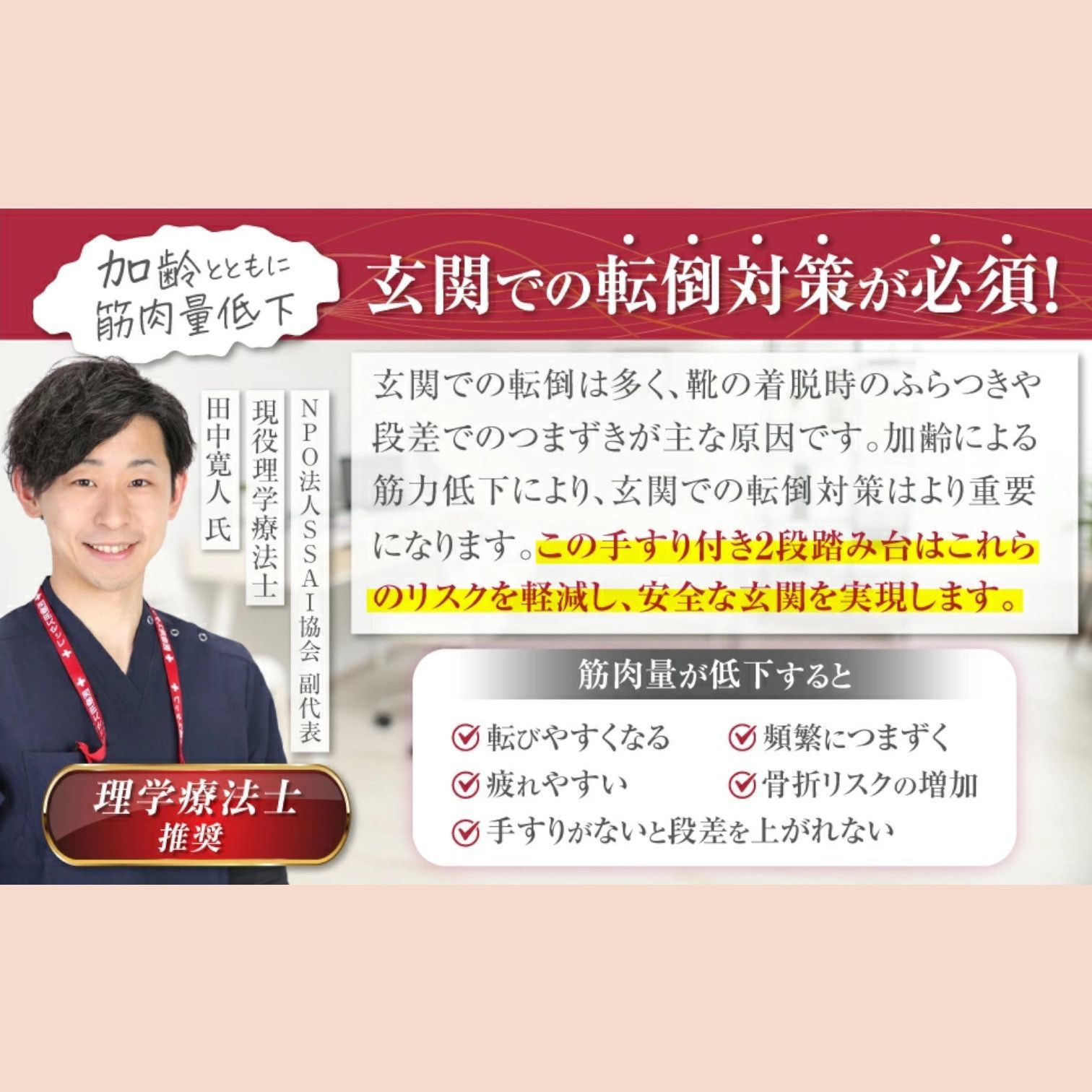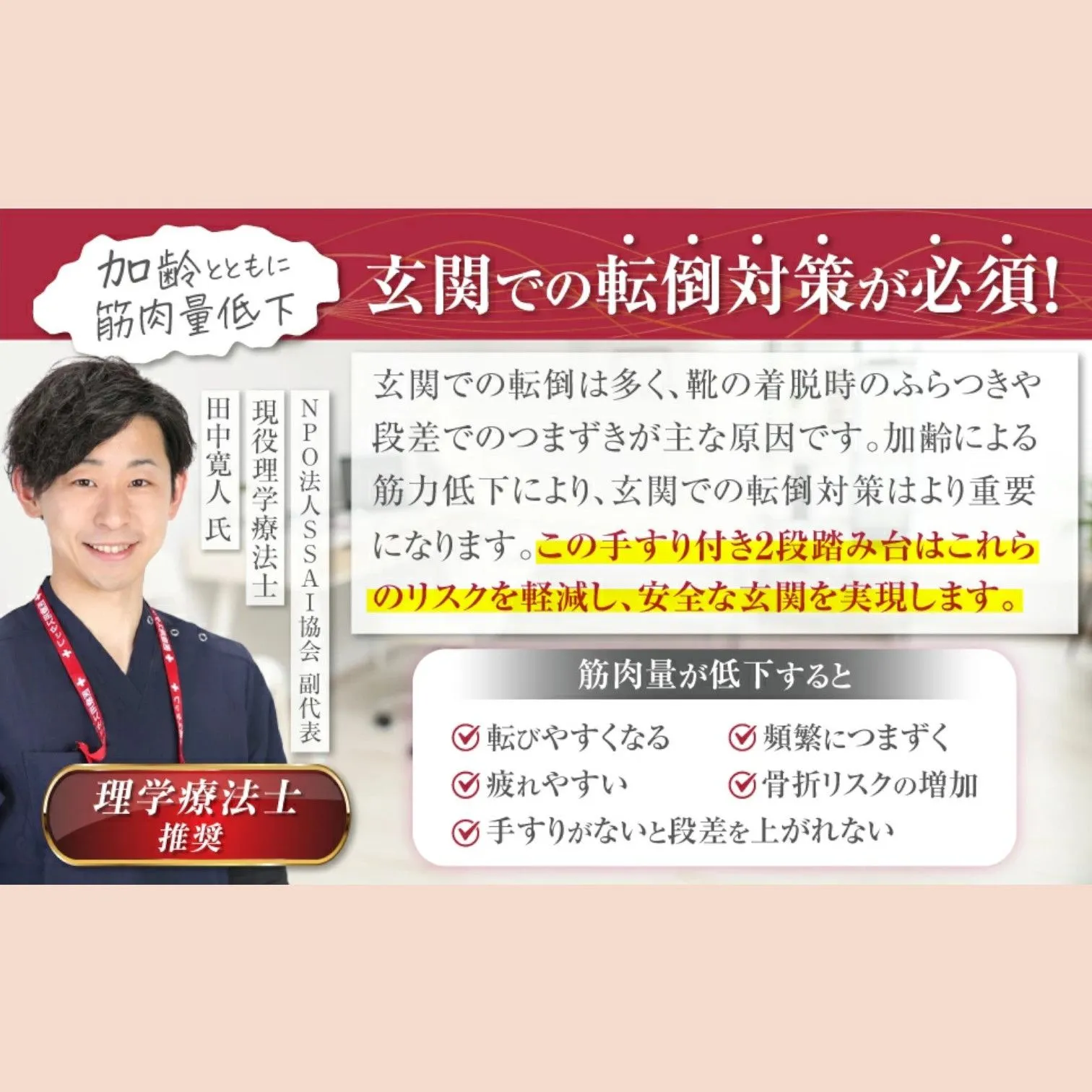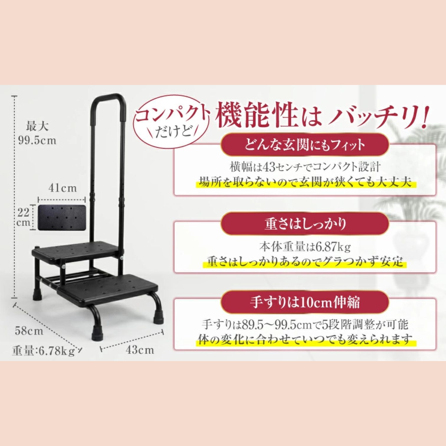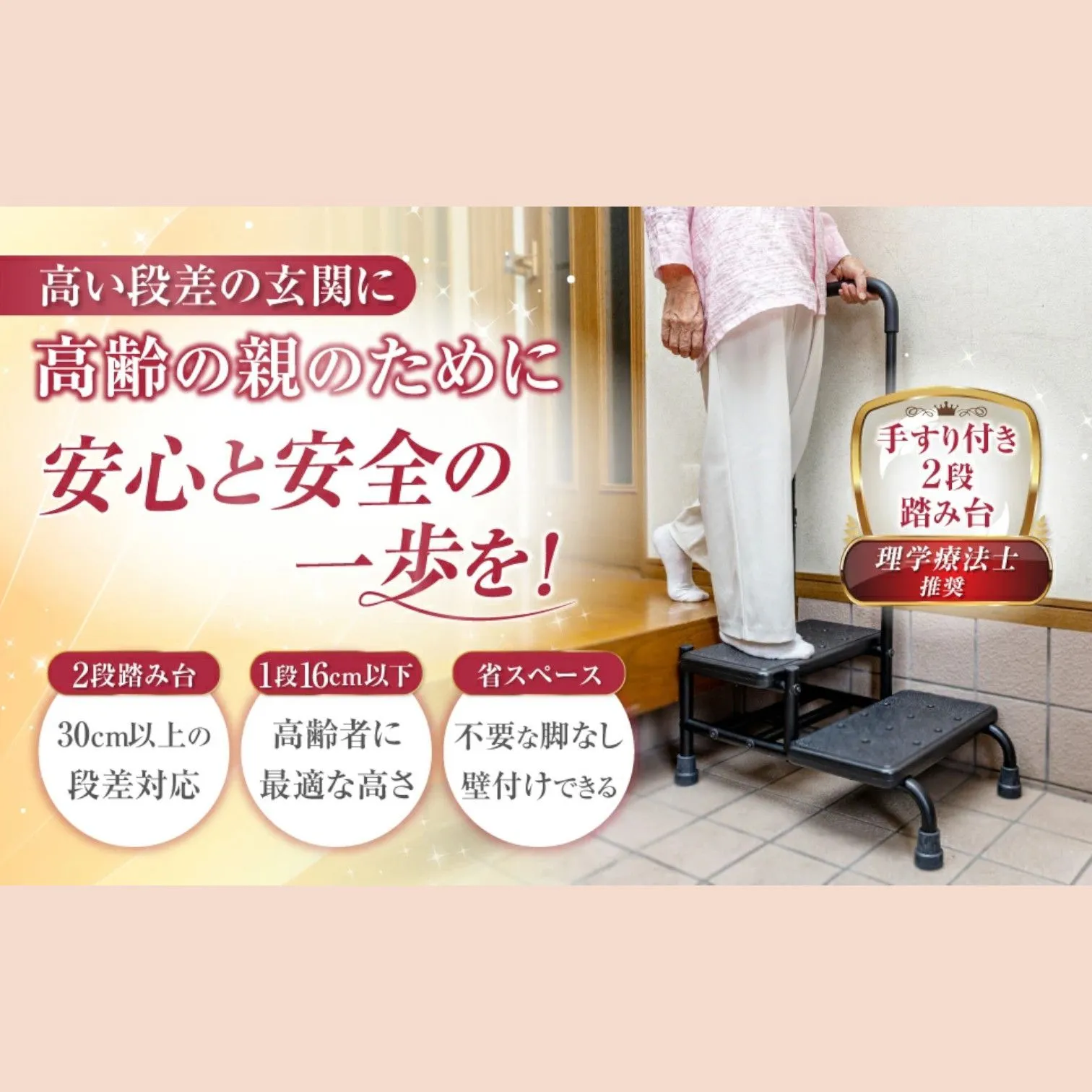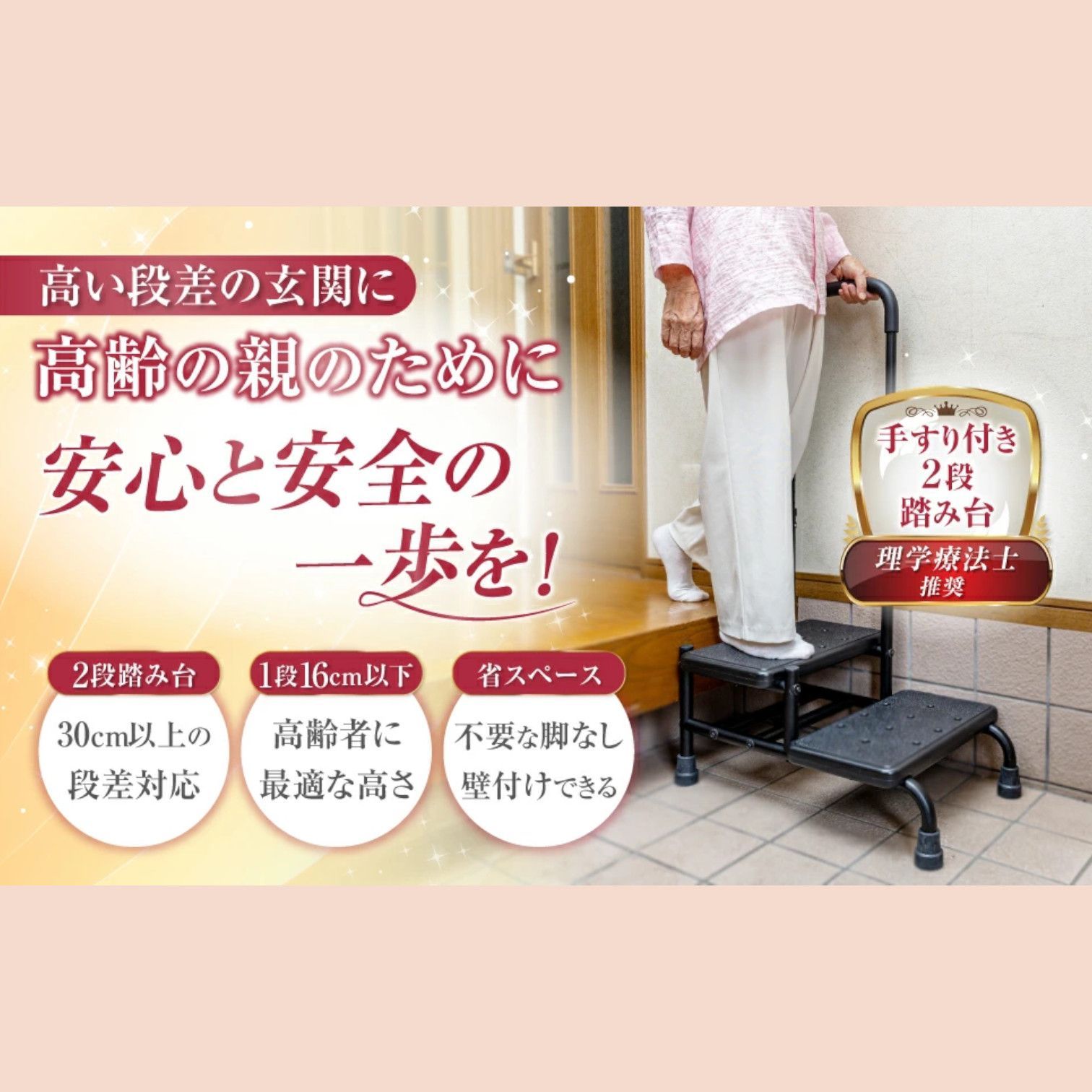 【壁を活かした安心設計】 壁にぴったり付けて設置することで、万が一のグラつきや転倒時にも壁が支えとなり、ケガのリスクを軽減します。 コンパクト設計のため、狭い玄関にも設置可能です🏠