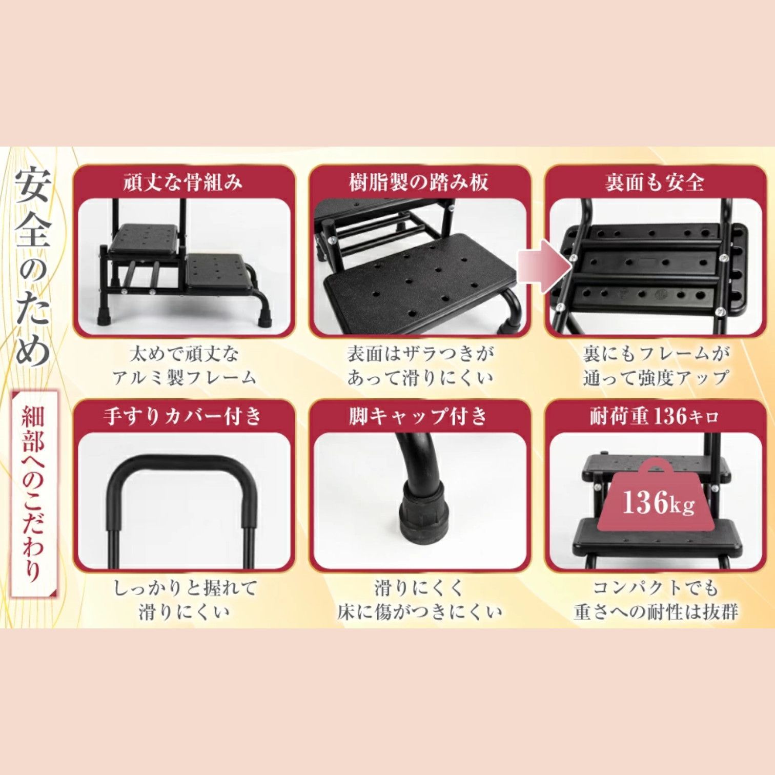 【滑りにくい踏み板】 踏み板には表面にザラつきを施した樹脂素材を採用。 靴下のままでも滑りにくく、安全性に配慮しています👣