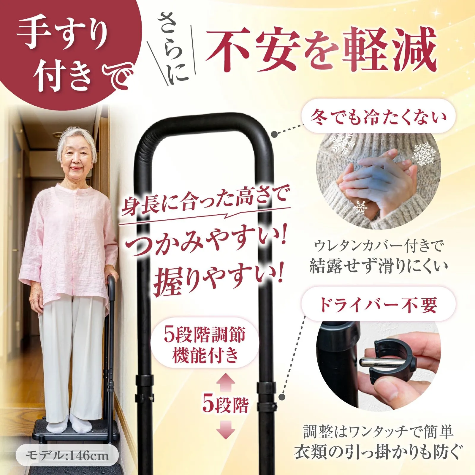 【高さ調整できる手すり】 手すりは身長に合わせて5段階(約10cm間隔)で高さ調整が可能。 ワンタッチ式でドライバー不要のため、体調や状況に応じて簡単に調整できます。 ウレタンカバー付きで握りやすく、冬場でも冷たくなりません🤲