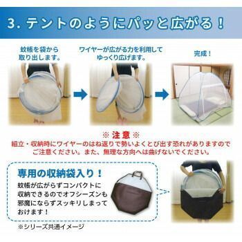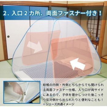 こちらの蚊帳は底面もネットでおおわれているので、下からのムカデ・ゴキブリ等の害虫の進入も防ぐことができます。また、入り口が2箇所ありどちらからでも入れるので、子供を寝かした後、こっそり反対側から出られたりと便利なことも。シーズンオフは蚊帳をたたんでコンパクトになるので、押し入れやクローゼットに収納できます。