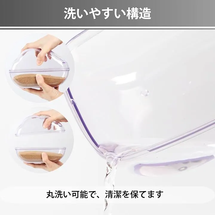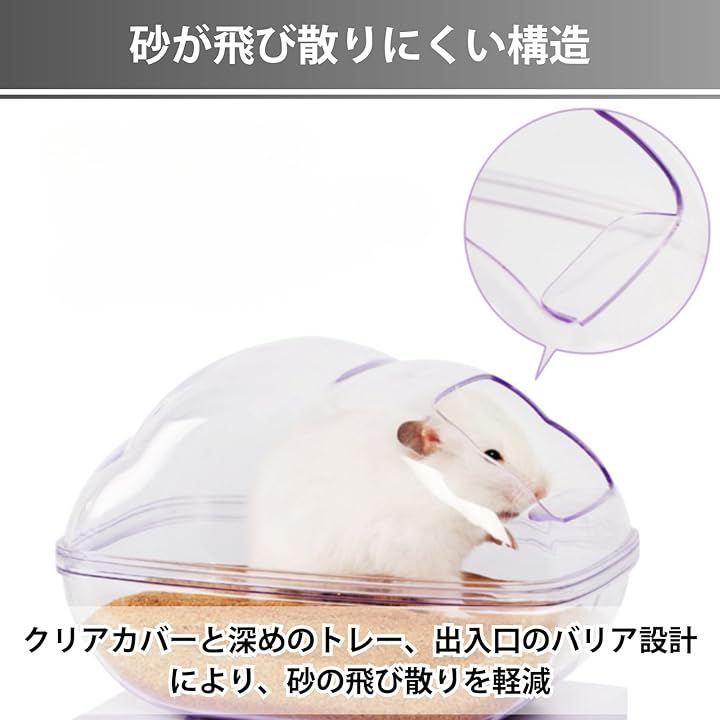 「砂が飛び散りにくい構造」 クリアカバーと深めのトレー、出入口のバリア設計により、砂の飛び散りを軽減。