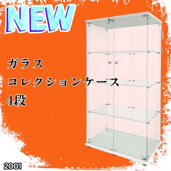 #2001 両扉 強化 ガラス ケース 4段 ホワイト 鍵付き 豆脚付き 転倒防止器具付き フィギュア プラモデル プラモ 鑑賞 展示 自宅 店舗 ディスプレイ 付属品 ※一部地域離島別途配送料有