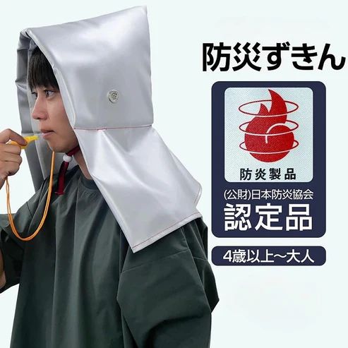 【日本防炎協会の防炎認定取得品】 防災専門機関が指定する「防炎性能試験」「衝撃吸収試験」 「洗濯性能試験」「毒性試験」のいずれにも合格した認定品! 当品には災害発生時に役立つと認められた製品である事を示す 「防災製品ラベル」が付けられています! 難燃ポリエステルを中綿に使用。 4cmの分厚さで落下物の衝撃から頭を守るだけでなく、 火災の炎からも大事な頭部を保護します。 耳が当たる部分に傾聴穴を配置。 ずきんを被っている時も、周囲の音や声が鮮明に聞こえます。 万が一閉じ込められたり逃げ遅れてしまっても。 付属のSOSホイッスルで助けを呼べます。 必要情報を記載できるネームタグを縫い付けています。 幼稚園・保育園・学校・オフィス・老人ホーム・ 施設などで大量配布時の「お名前記載」にもご利用いただけます。