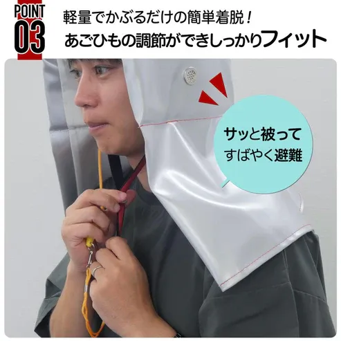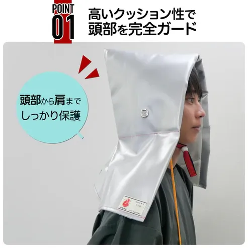 【製品詳細】 子どもから大人まで使える、フリーサイズの防災ずきん。 地震発生時や火災発生時の落下物などから頭部・肩を守ります。