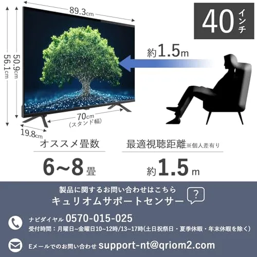 【商品仕様】本体寸法:[スタンドなし]89382509mm [スタンドつき]893198561mm 本体質量:[スタンドなし]5.5kg [スタンドつき]5.6kg 画面サイズ:40V型 解像度:19201080 コントラスト比:5000:1 視野角(標準値):左右約178/上下178 応答速度:9.5ms チューナー:地上デジタル2、BS、110度CSデジタル2(ダブルチューナー)※1つは視聴専用・2番組同時録画は非対応 音声出力(スピーカー):6W6W Bluetoothバージョン:5.1 壁掛け寸法:VESA規格200200mm USB端子:USB2.02 定格電源:AC100V