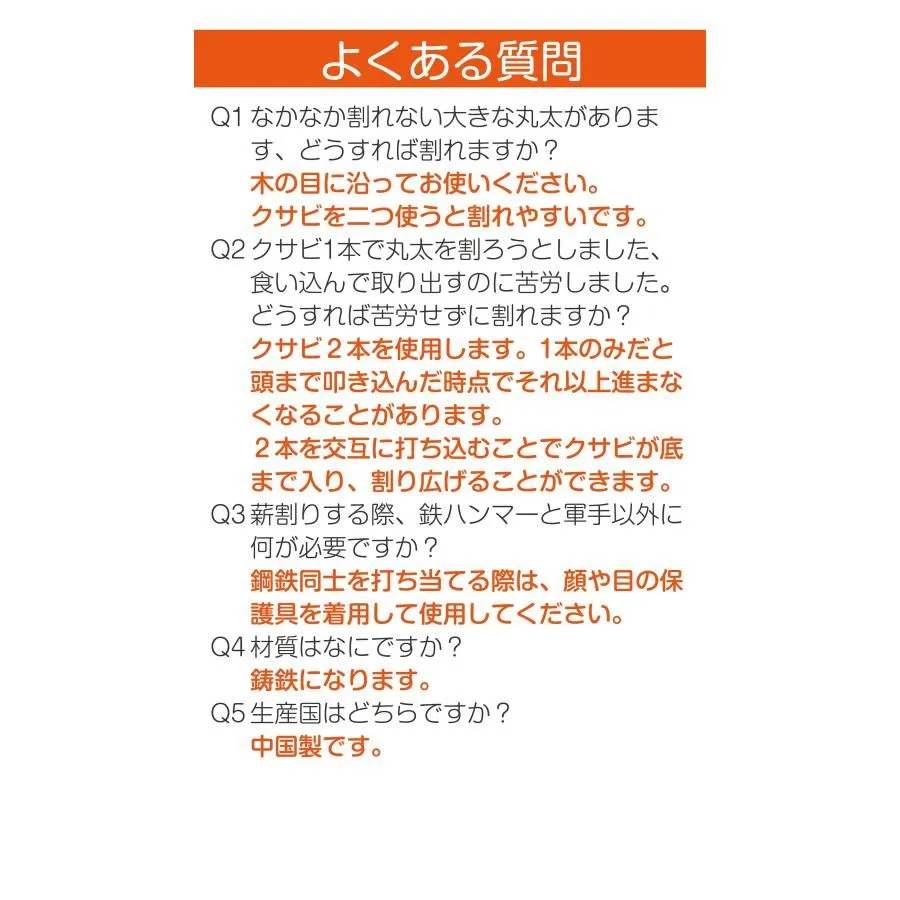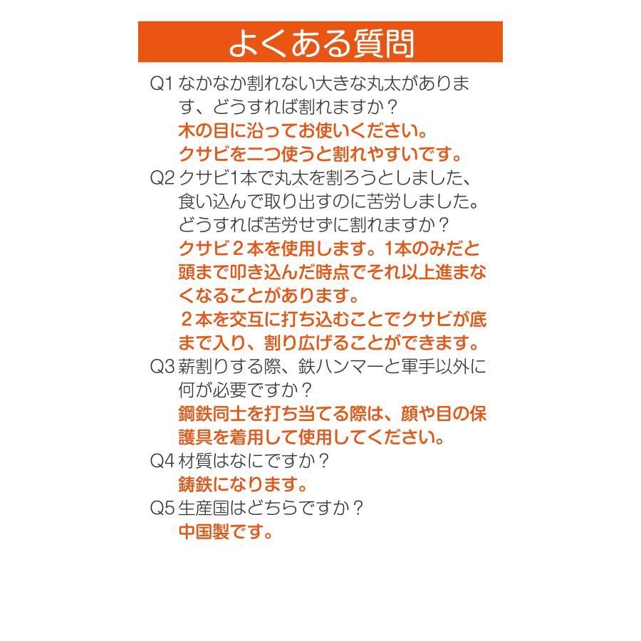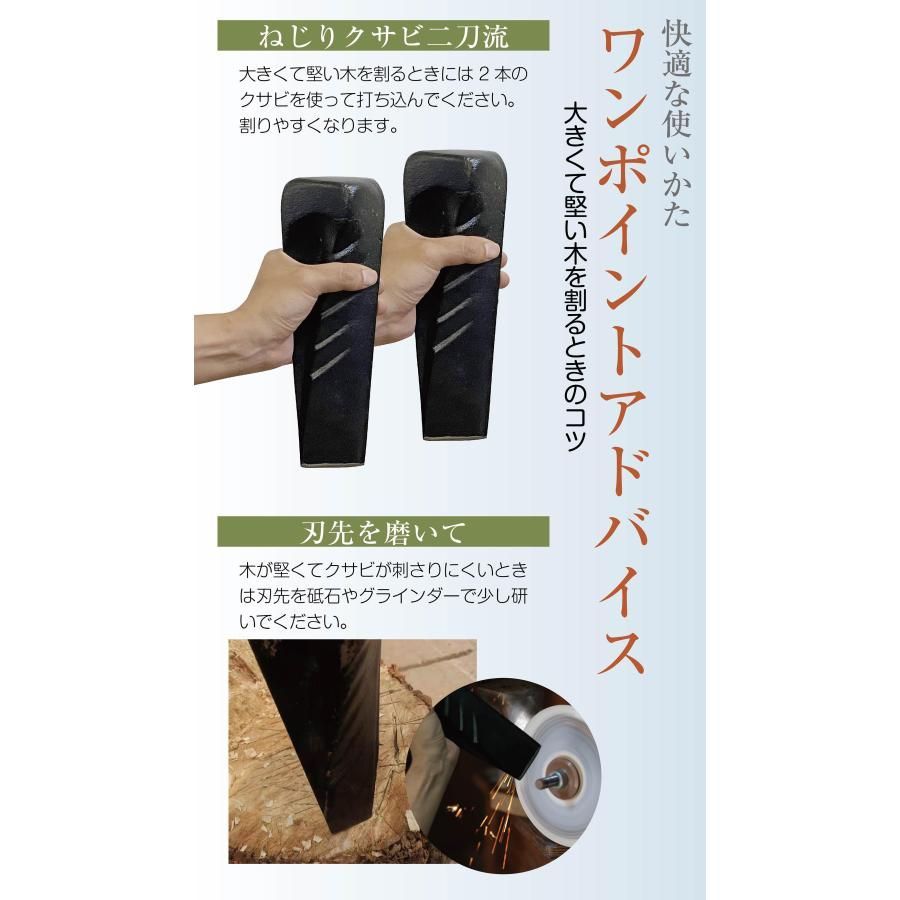 【✨ 2本使いでさらに効果アップ】 クサビは1本よりも2本同時使用がおすすめ! 1本だけだと途中で進まなくなることがありますが、 2本を交互に軽い力で打ち込むことで、底まで入り込み一気に割り広げられます🔨