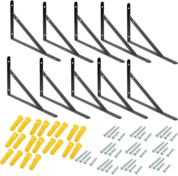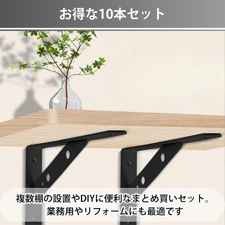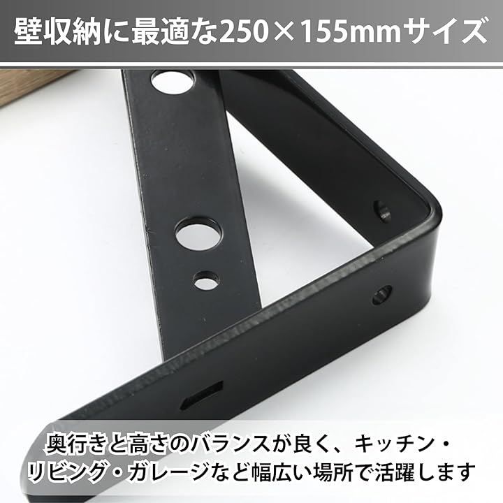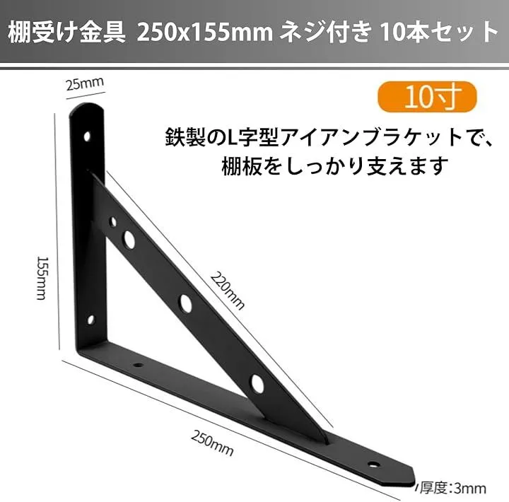 Aurenne 棚受け金具 L字型 アイアンブラケット 鉄 壁掛け 壁収納 棚補強 DIY ネジ付き (ブラック10本セット, 250x155mm)
