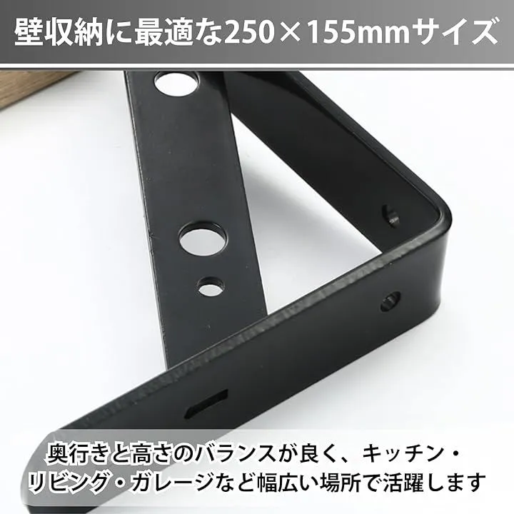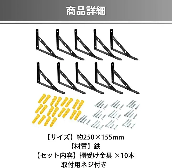 「サイズ」約250x155mm 「材質」鉄 「セット内容」棚受け金具 x10本 取付用ネジ付き