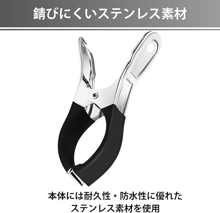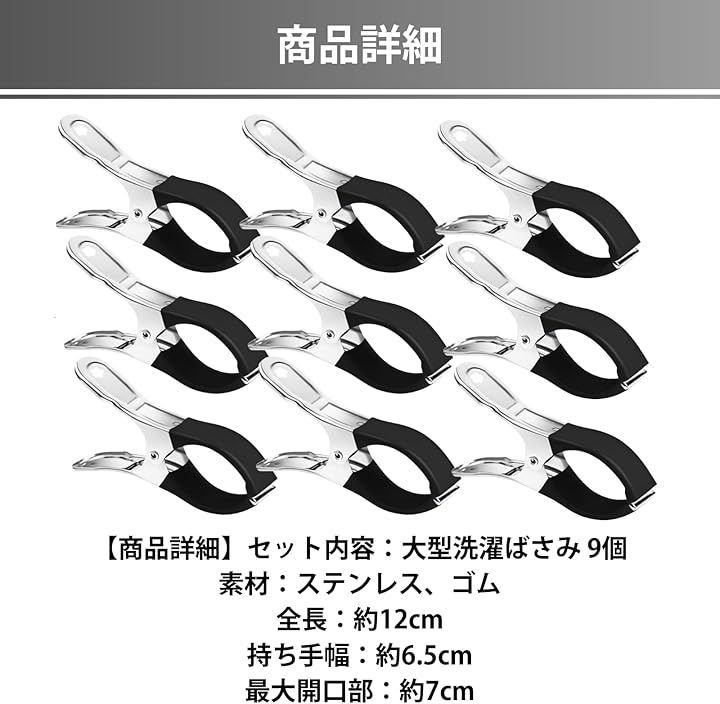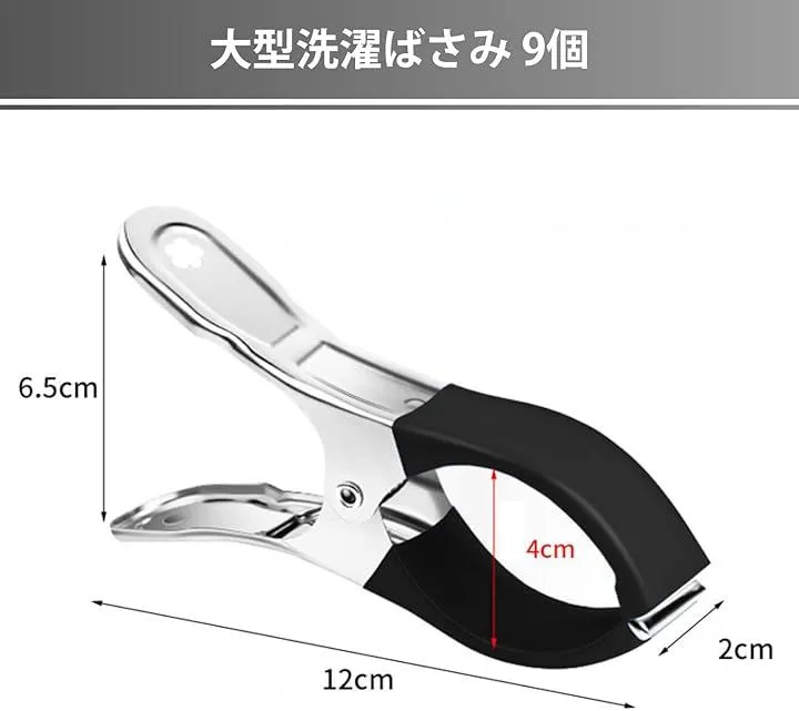 「商品詳細」セット内容:大型洗濯ばさみ 9個 素材:ステンレス、ゴム 全長:約12cm 持ち手幅:約6.5cm 最大開口部:約7cm