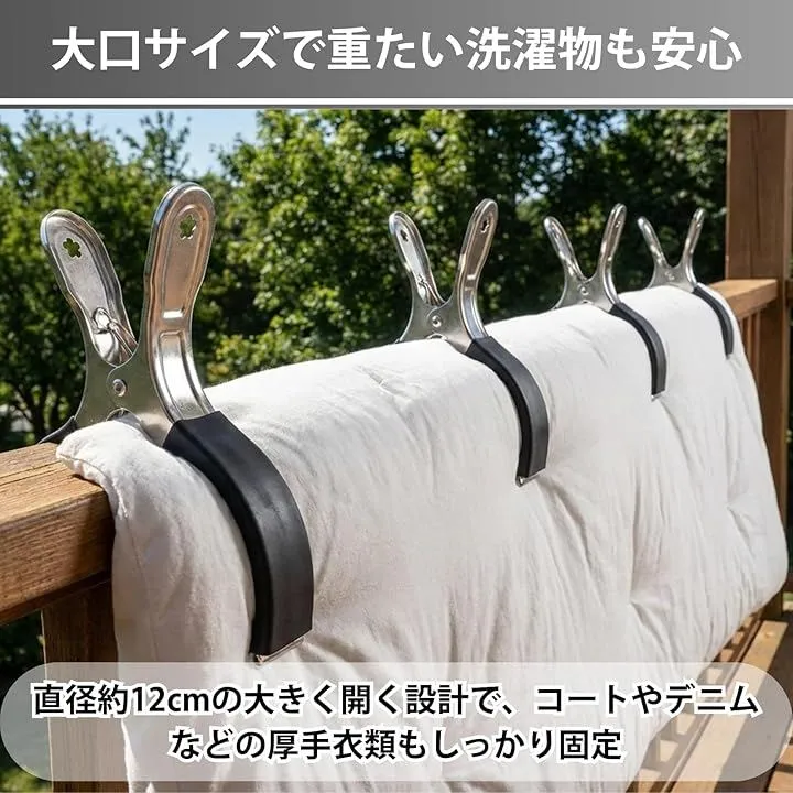 「大口サイズで重たい洗濯物も安心」 直径約12cmの大きく開く設計で、コートやデニムなどの厚手衣類もしっかり固定。