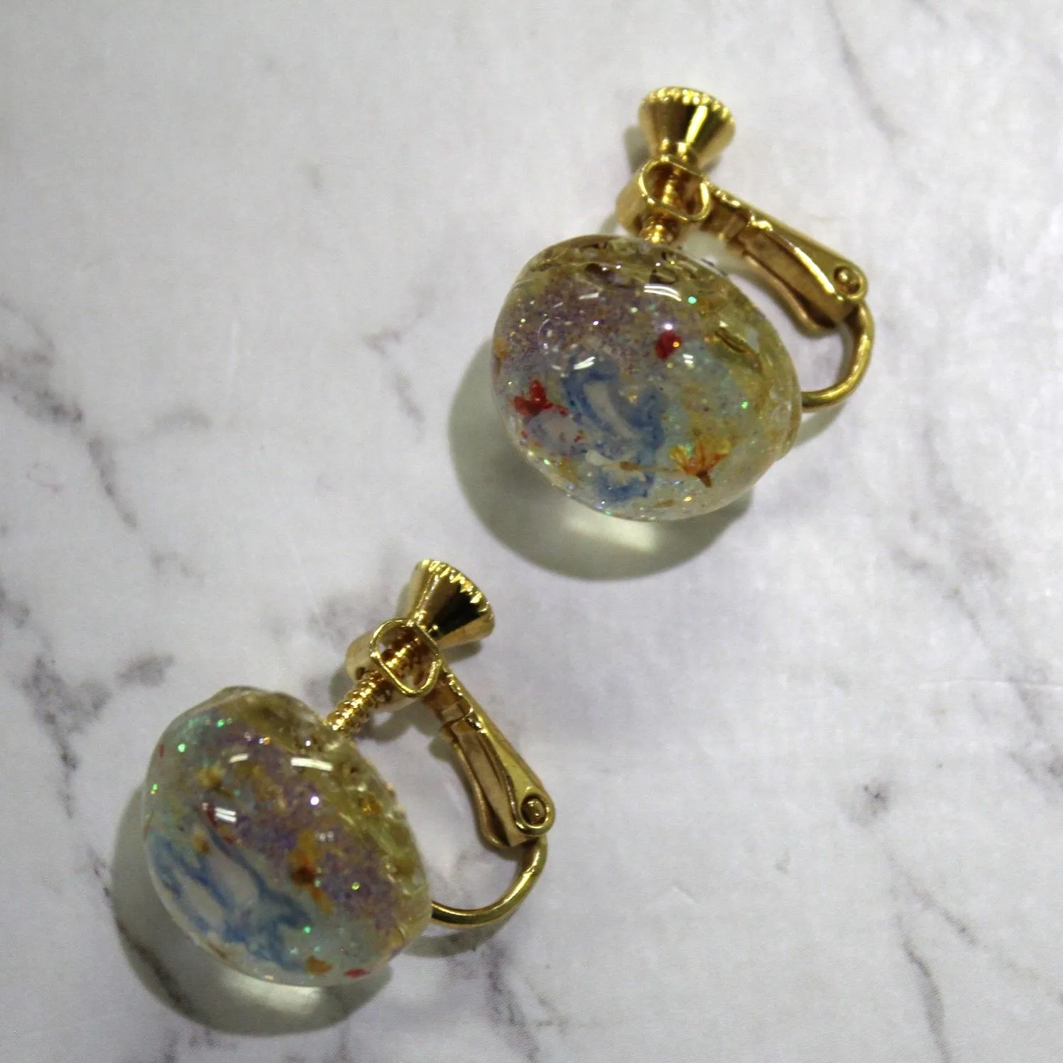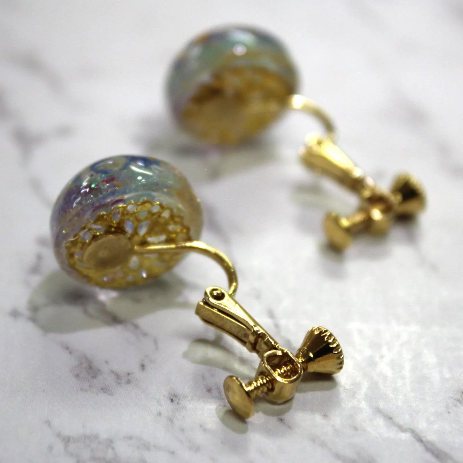 水玉模様と小さな宇宙を閉じ込めたような、キラキラ輝くイヤリングです。