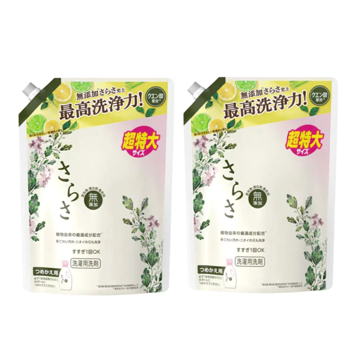 洗濯洗剤さらさは、無添加* さらさ史上最高洗浄力(蛍光剤、漂白剤、着色料無添加) 皮膚科医監修のもと、肌テスト済み*。肌に優しい。(*全ての人の肌に影響がないわけではありません) 天然酵素を配合。汚れを落として、本来の白さへ。(*汚れ落ち洗浄試験で評価) ママが選ぶ無添加洗剤銘柄No. 1* (*2016年GfK調べ(N=303)「お母さんが選ぶ、赤ちゃんのための日本の無添加洗剤No.1」という質問に対して) すすぎ1回OK、洗剤残りの心配なし。優しい柑橘系の香り
