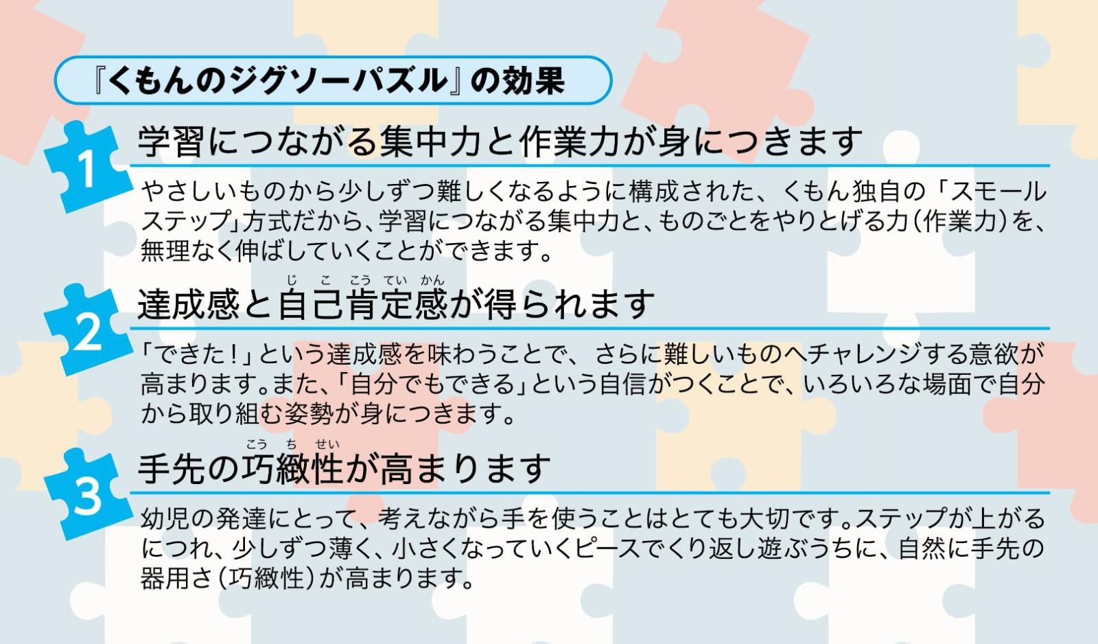 【『くもんのジグソーパズル』は学習につながる集中力と作業力を善なう「教具」です】 『くもんのジグソーパズル』は1984年の発売以来、幼児でも遊びながら無理なく集中力と作業力を伸ばすことができる「教具」として、長年にわたり公文式教室や幼稚園などで利用されてきました。 それは、公文式の指導の実践をとおして、1歳代の乳幼児であっても2ピースや4ピースといったやさしいパズルでくり返し遊ぶことで、パズルを完成させる楽しさや達成感を味わいながら、教材やドリルの学習につながる、集中力と作業力を身に着けられることが分かったからです。 安全警告 - 最後までご確認頂き誠にありがとうございました。 上記をご確認頂き、ご購入いただけましたら幸いです。 何かご不明な点がございましたらお気軽にメッセージからお問い合わせ下さい。