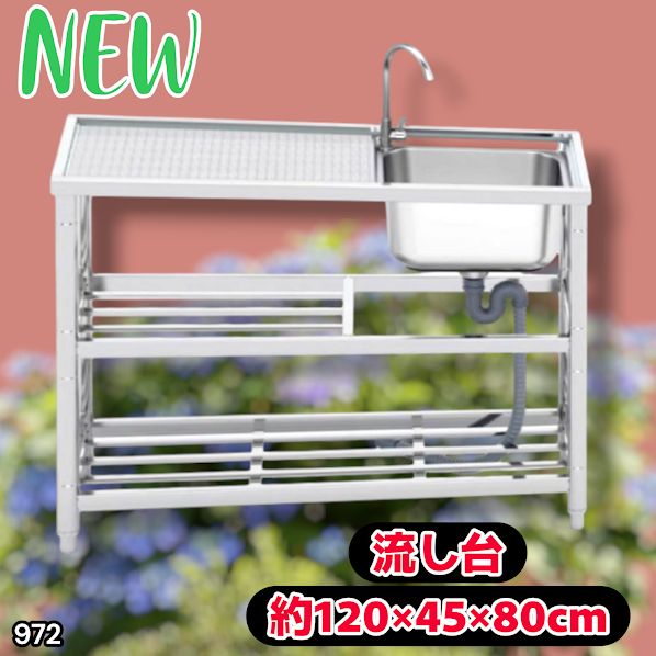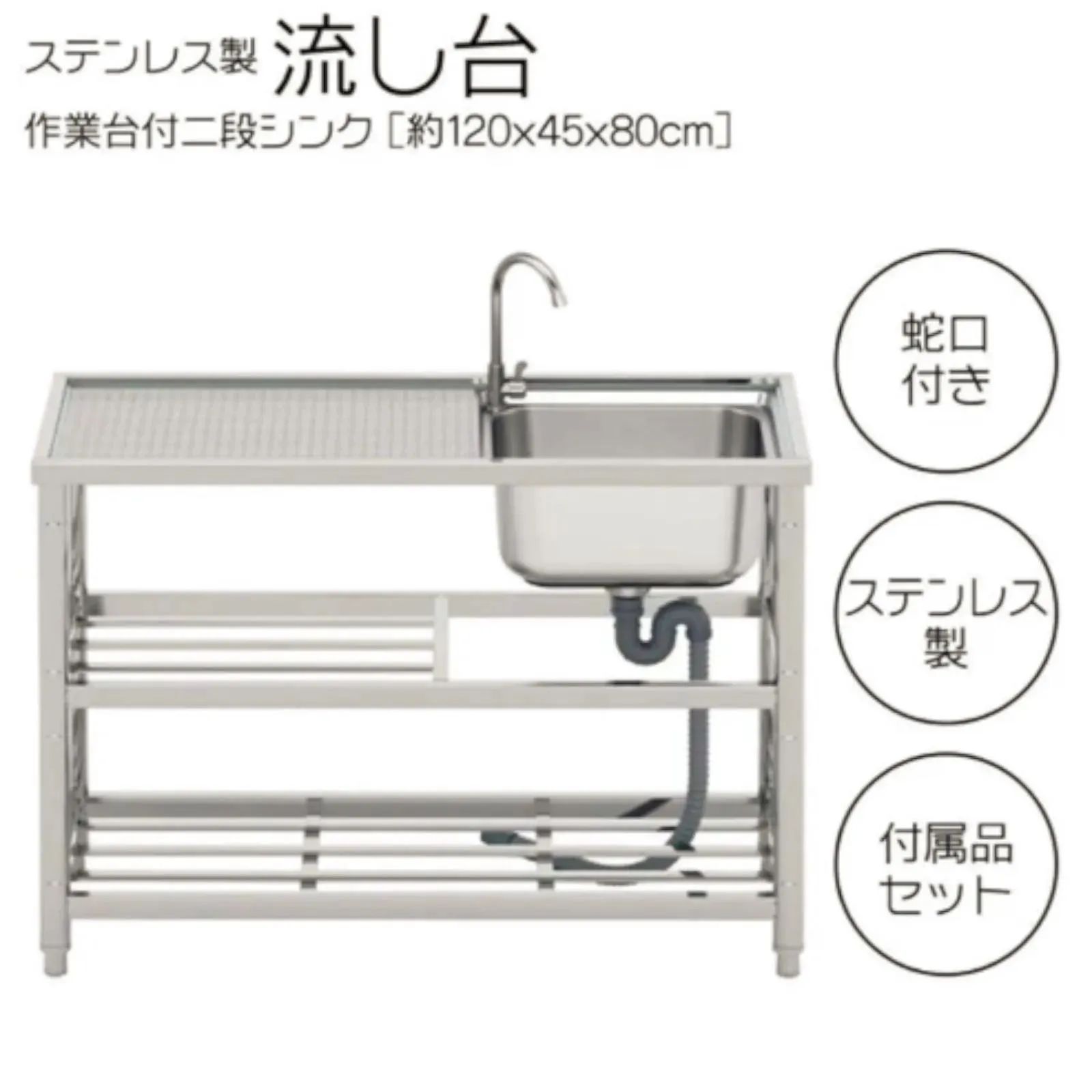 #972 ステンレス製 流し台 2段 作業台付き 約幅120×奥行45×高さ80cm ステンレス製で丈夫で長持ち 必要な付属品が全てセット A120 ※一部地域離島別途配送料有