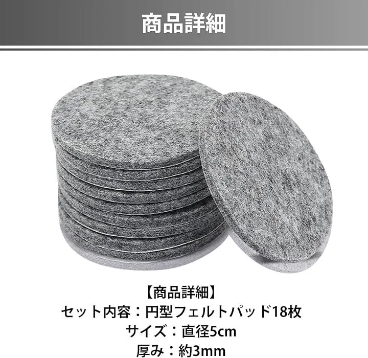 「商品詳細」セット内容:円型フェルトパッド18枚 サイズ:直径5cm 厚み:約3mm