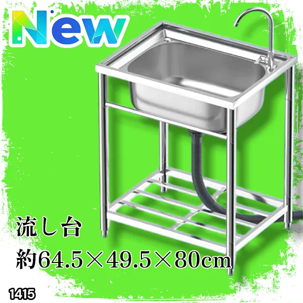 #1415 ステンレス製 厚みプラス 流し台 サイズ幅64.5×奥行き49.5×高さ80cm 深型シンク 蛇口付き 丈夫で長持ち 豊富な付属品 便利なタオル掛け S61 ※一部地域離島別途配送料有